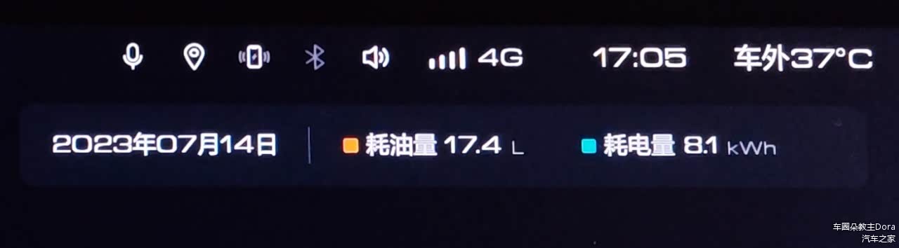 本次试驾于宁波,行程一共232.1km,从酒店往返于越野试驾场地,市区高速道路二八开,天气那是一个热,路面温度42度,全程开启空调,路上花了4.5小时,另外怠速开启空调近2.5小时尝试给车辆补电。最终耗油17.4L,耗电8.1度。