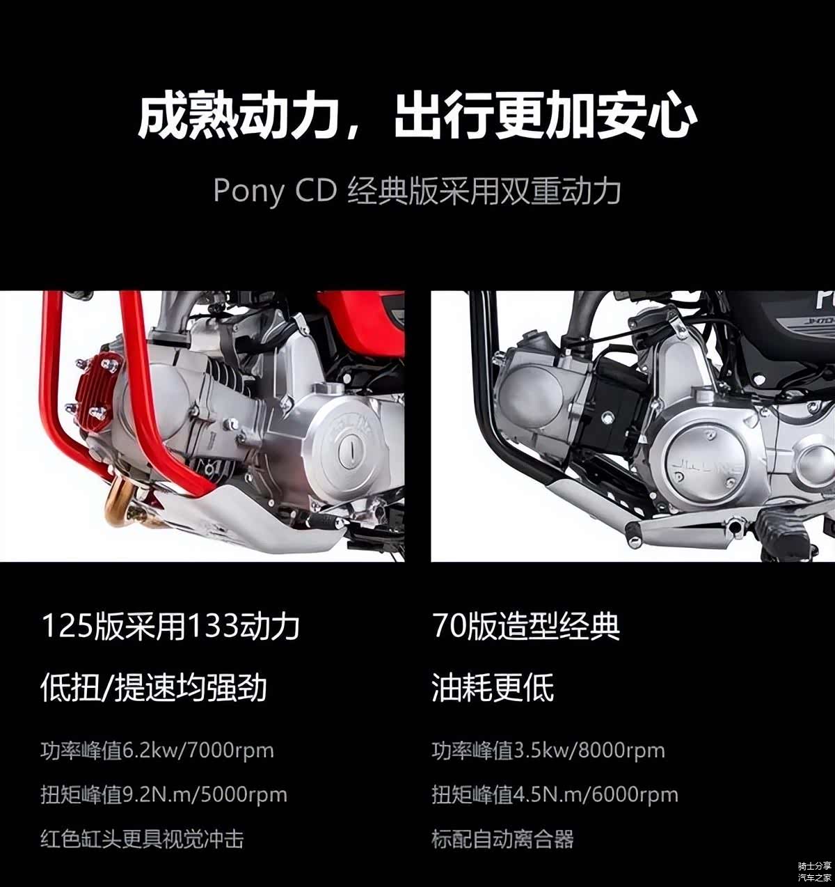 这款125mL版本,其发动机是嘉陵旗下非常有名的133成熟机型,最大功率6.2kw,最大扭矩9.2N·m,功率和扭矩表现都不错,是对于这么一辆小车来说动力绝对是绰绰有余的。再加上这台125排量的经典款是用的普通离合器,用的4挡循环设计(事实上125mL和70mL的Pony CD经典版均有手动离合和自动离合两种版本可选),比起70排量的车来说显然更具玩乐性。