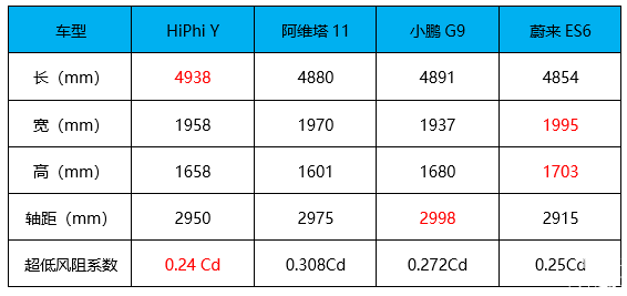 还有在超低风阻系数,HiPhi Y有着同级领先的0.24 Cd超低风阻系数。这个数据是什么概念呢?阿维塔11为0.308Cd、小鹏G9为0.272Cd、蔚来ES6为0.25Cd、更低的风阻系数,不仅为HiPhi Y带来更极致的驾驭快感,更有效降低行驶风噪,进一步提升续航能力。而动力、续航方面,每款车都有不同的版本,各有各的优点。