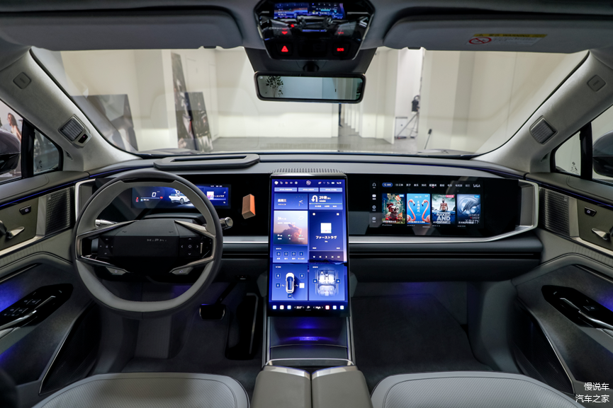 第三,座舱以都市天际线为设计灵感,17英寸OLED中控屏+12.3英寸全液晶仪表+15英寸高清副驾娱乐屏组成了贯穿仪表台的大联屏。同时,新车还具有22.9英寸抬头显示+9.2英寸流媒体后视镜,这样算下来,HiPhi Y拥有一套5屏布局,此外,还配智能冰箱、英国之宝音响。