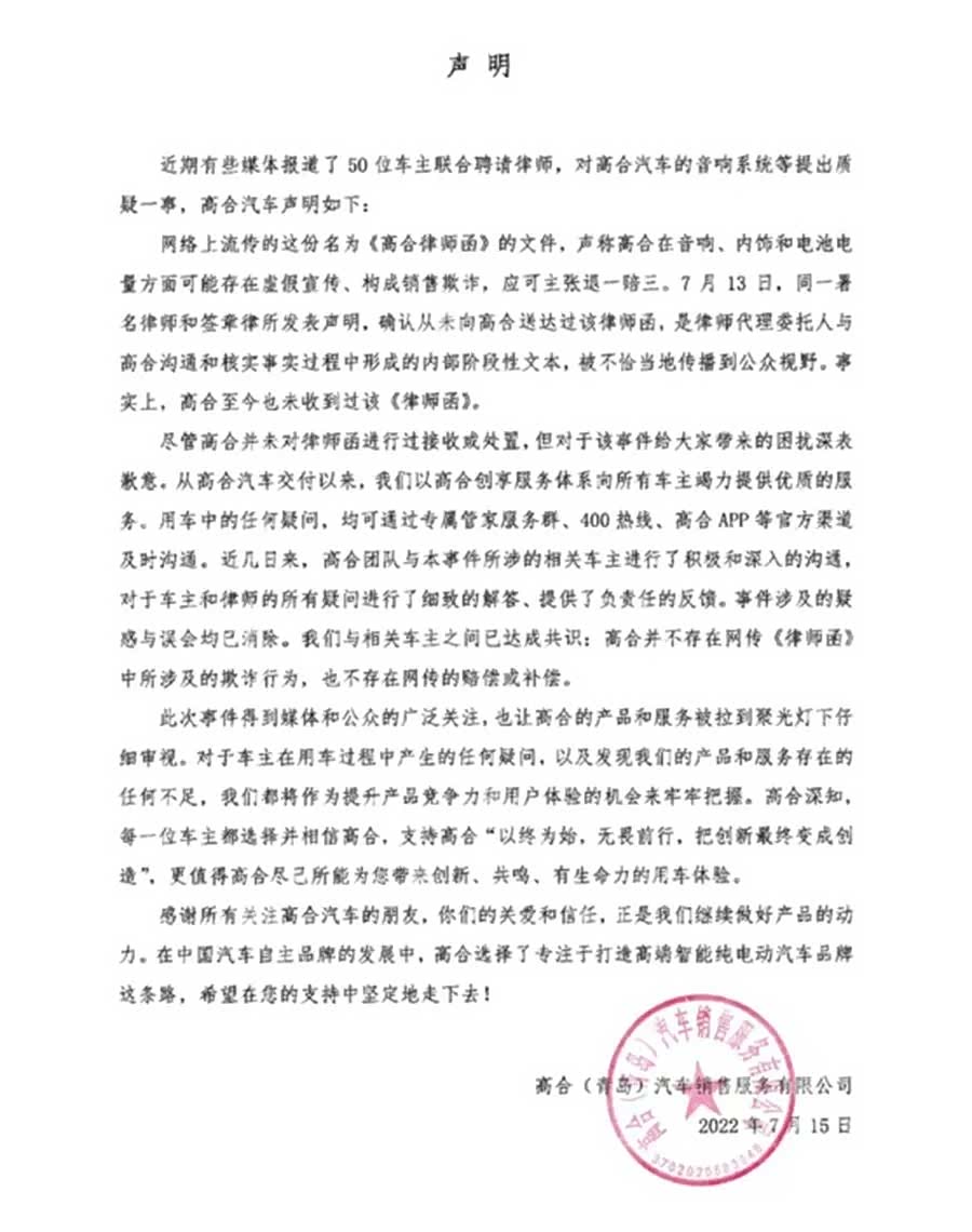 此外,在产品质量方面还有待改善,2022年7月,50位车主集中向高合汽车维权,认为高合HiPhi X存在虚假宣传,其中包括音响、内饰材料、电池三个方面:有人发现音响并非英国之宝,而是国产品牌音响;再有,车内饰材质为“半苯胺内饰”,但实际上仅在座椅部分采用半苯胺真皮;还有HiPhi X的动力电池容量为97kWh,但实际容量仅为94.3kWh。还有记录仪疑似泄露隐私事件等。