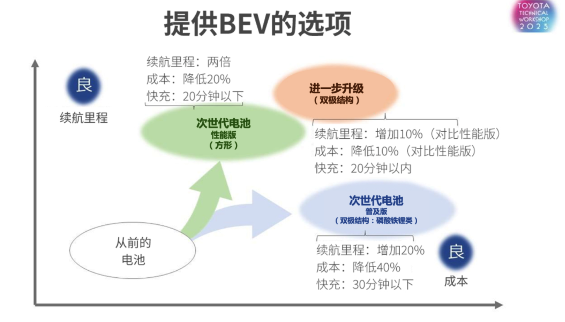 在这次技术说明会上,官方重点提到了次世代车型的电池方面,其中丰田将主推“性能版电池”、“普及版电池”和“高性能版电池”。