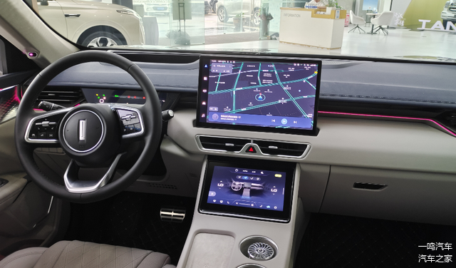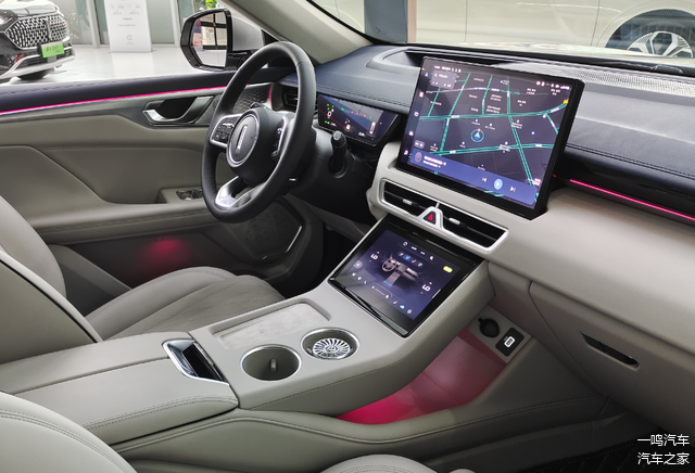 内饰方面,中控台采用对称式设计,在科技感方面也是不缺的,中间搭载一款14.6英寸液晶屏,配合9.2英寸全液晶仪表盘加上W-HUD抬头显示以及操控区的9英寸空调触控面板,智能化感觉很强烈。而小魏同学2.0支持可见即可说、20秒不间断畅聊等功能,很多操作可以释放双手。操控区配备50W快充面板,周边的大面积用料采用软性材质,触感和档次感都不缺。
