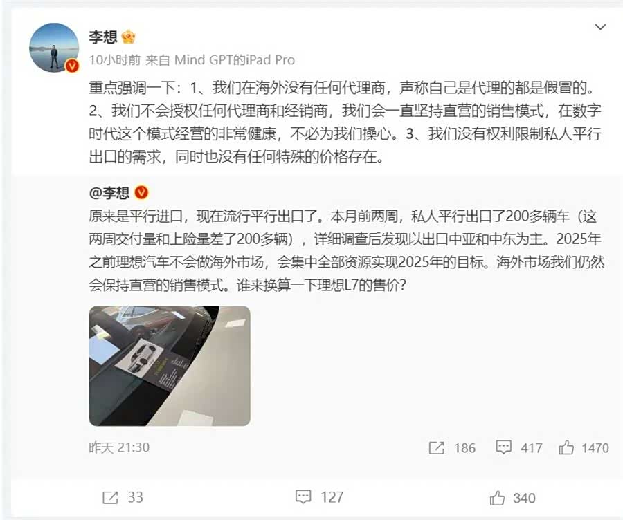 日前,理想汽车CEO李想在微博发文表示,这个月前两周有200多辆车被人平行出口到了国外(这两周交付量和上险量差了200多辆),详细调查后发现以出口中亚和中东为主。