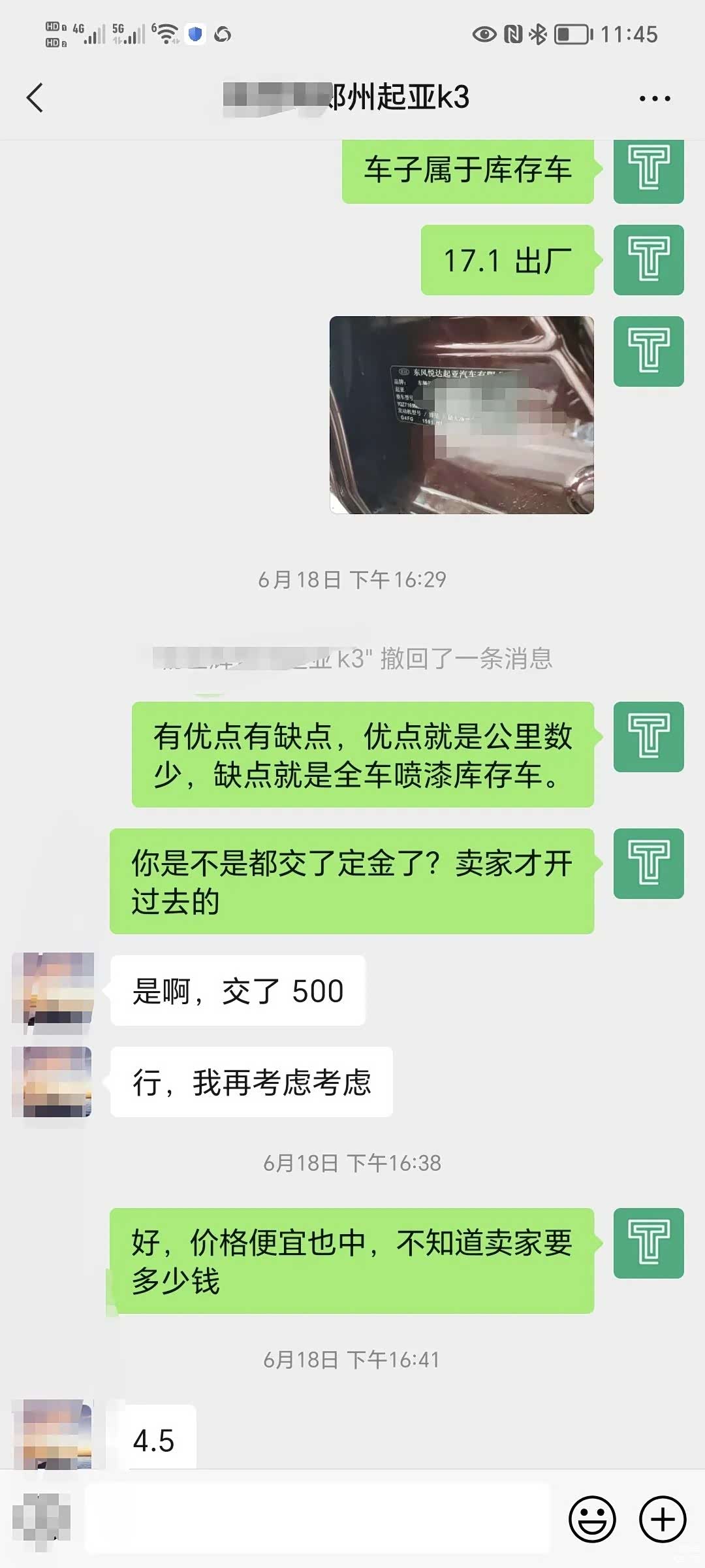 这台车是起亚K3 2016款 1.6L手动GLS,卖家说是2018年6月上牌,一手车,只跑了6900公里,车况方面,客户说卖家也给保障了无重大事故无泡水无火烧,价格谈到4.5万。