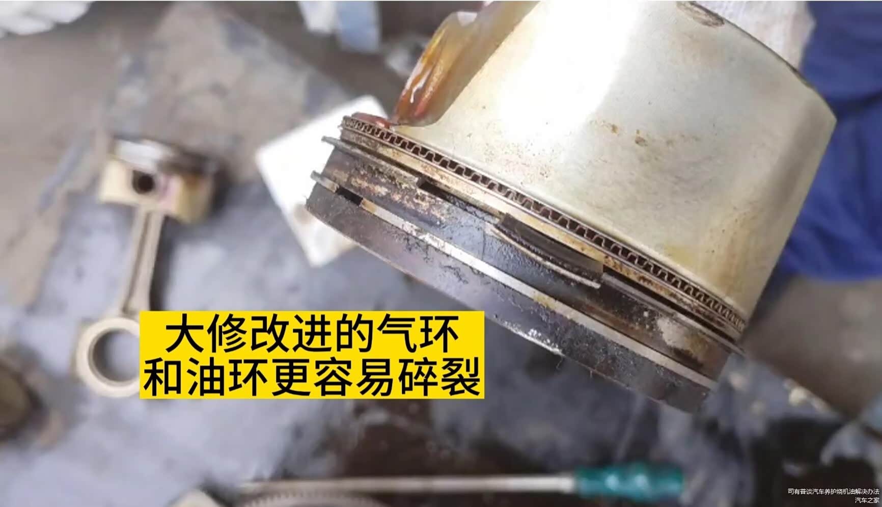 第五点,为什么大修都更换了改进的气环和油环,这主要是考虑了分体的油环内的储油容量更大,这种油环只是从表面上解决了一个刮油效能,但是密封性能下降会导致机油中更多的油泥出现,机油衰减要快很多,所以,采用这分体式活塞环的发动机建议提前点更换机油,同等温度下,机油中的浮游颗粒越多越容易堵塞油环,分体环也不例外,现在分体环的发动机因为油环堵塞问题导致烧机油的遍地都是。气环从原来的平口环更换成封口环,封口环因为在封口处是削弱了环体的厚度,在同样强大的缸内压力下,更容易磨损和碎裂,平口环两端都是一样粗细,耐压更好,极少出现断裂情况。