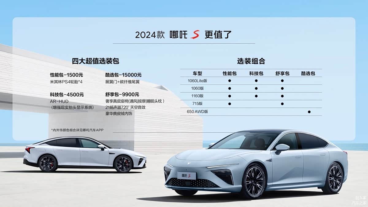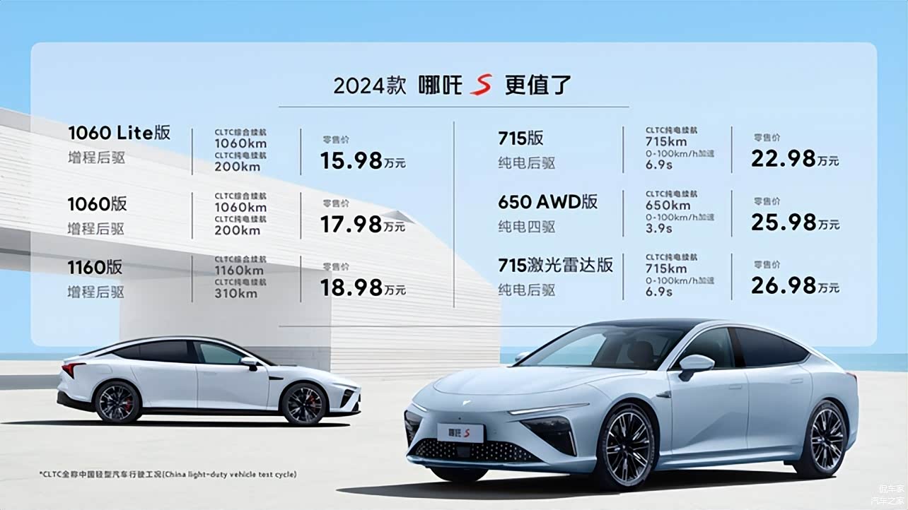 2024款哪吒S提供增程式电动、纯电两种动力类型,新增2款纯电续航200公里的增程车型,分别为1060版和1060 Lite版,进一步降低哪吒S的入门门槛,同时也极大丰富增程车型选择,能够更好的满足消费者更细分的需求。与此同时,2024款车型充分下放用户高感知配置,把大家更关心、更想要的配置功能纳入标准配置,以便简化用户选购时对比过程并获得更优选择,当然性价比也是更高了。