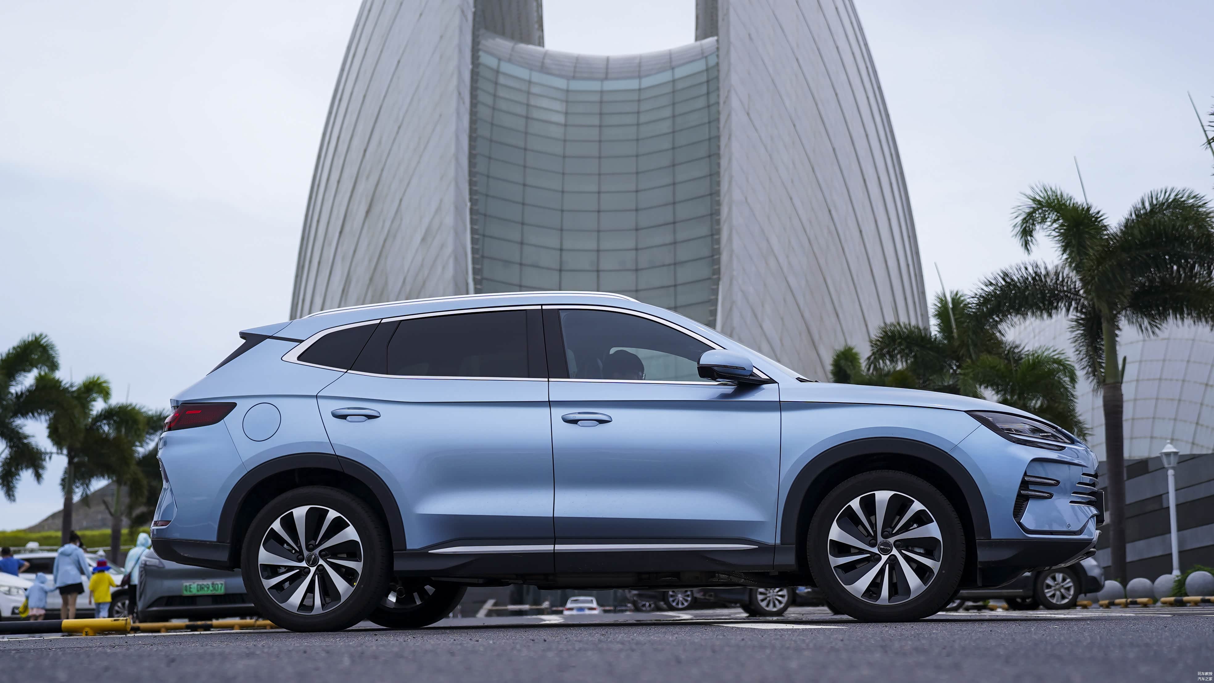 侧面的造型与旧款车型保持一致,机盖处有一条腰线贯穿整个侧面连接尾部,整体视觉较为简洁大气,配合车门下方的曲面造型,层次感十足。尺寸方面,宋PLUS DM-i冠军版的长宽高为4775*1890*1670mm,长度增加70mm,轴距依旧是2765mm,视觉上比旧款车型更长、更扁平了一些,运动氛围也更加浓郁。