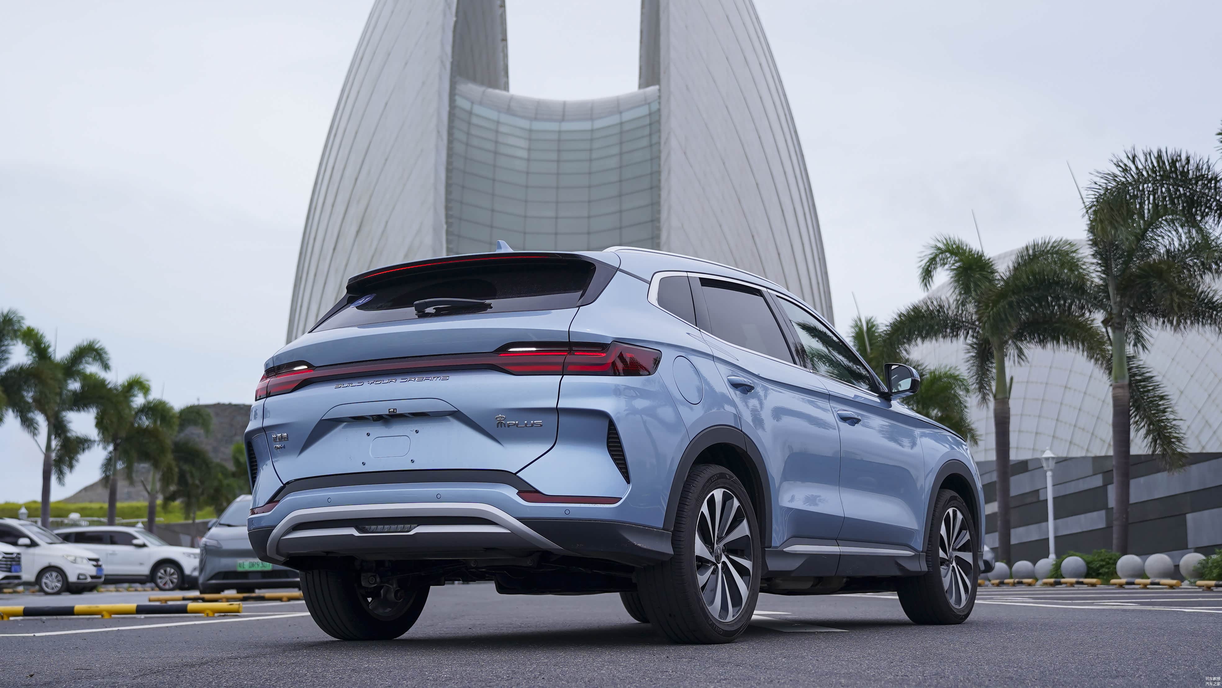 尾部造型沿用了贯穿式尾灯设计,整体变化并不大,主要体现在细节处。比如取消了尾灯上的镀铬装饰,下方的后包围进行了重新设计,加大了护板面积,进一步提升运动感。后牌照框的位置也移至尾门底部,降低视觉重心,采用隐藏式排气进一步强化比亚迪宋PLUS DM-i冠军版新能源车的身份。