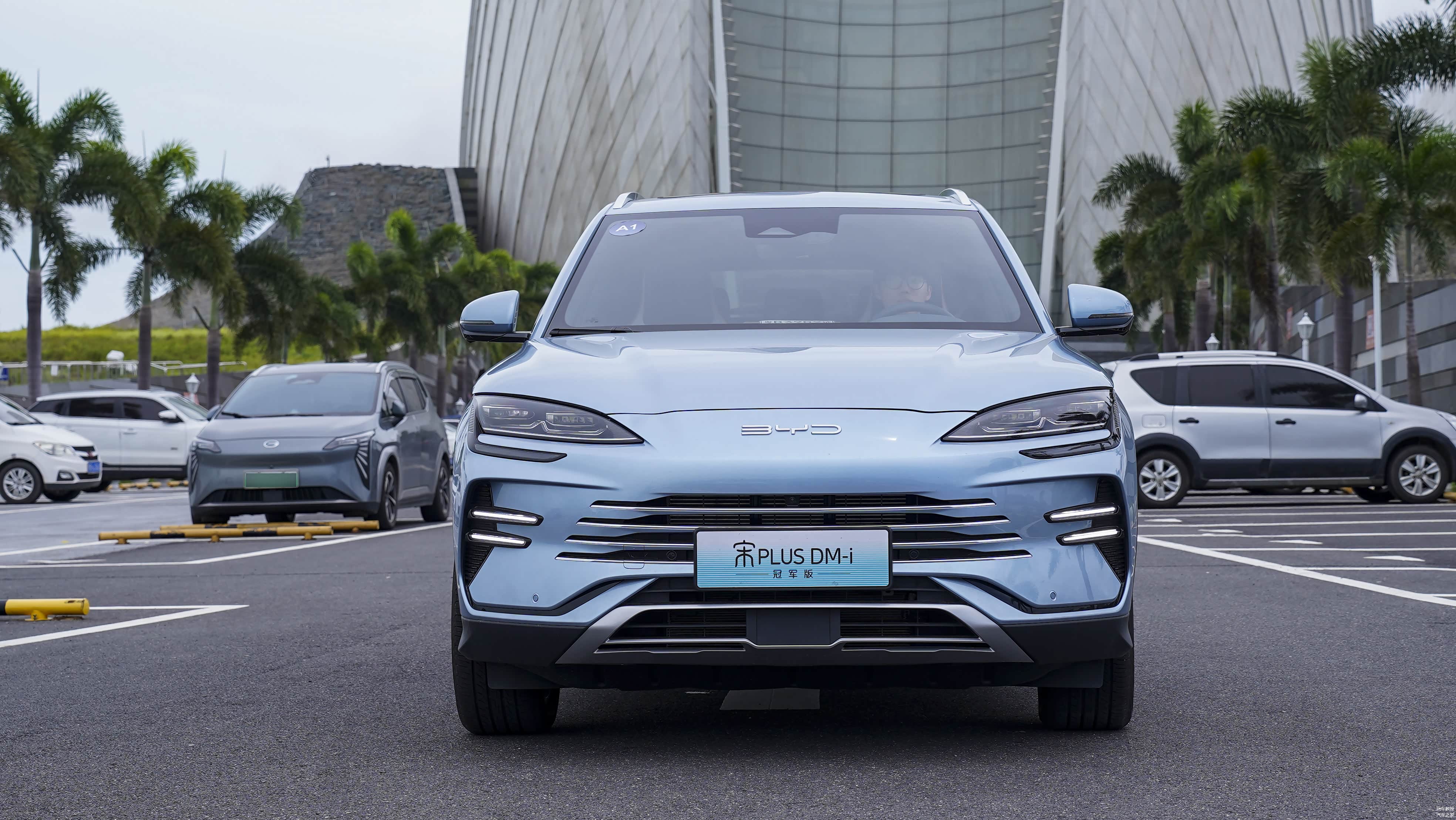 如果说旧款车型还有些许燃油车气息,那比亚迪宋PLUS DM-i冠军版则更具新能源的风范。整个前脸尽显海洋网的设计语言,更具科技感的分体式大灯组搭配上尺寸进一步缩小的前进气格栅,“海味十足”。两侧类似C字形的设计十分犀利,配合上日间行车灯,辨识度进一步提高,原来车头的“宋”字车标也被“BYD”英文车标所取代,视觉上确实更加年轻时尚一些。