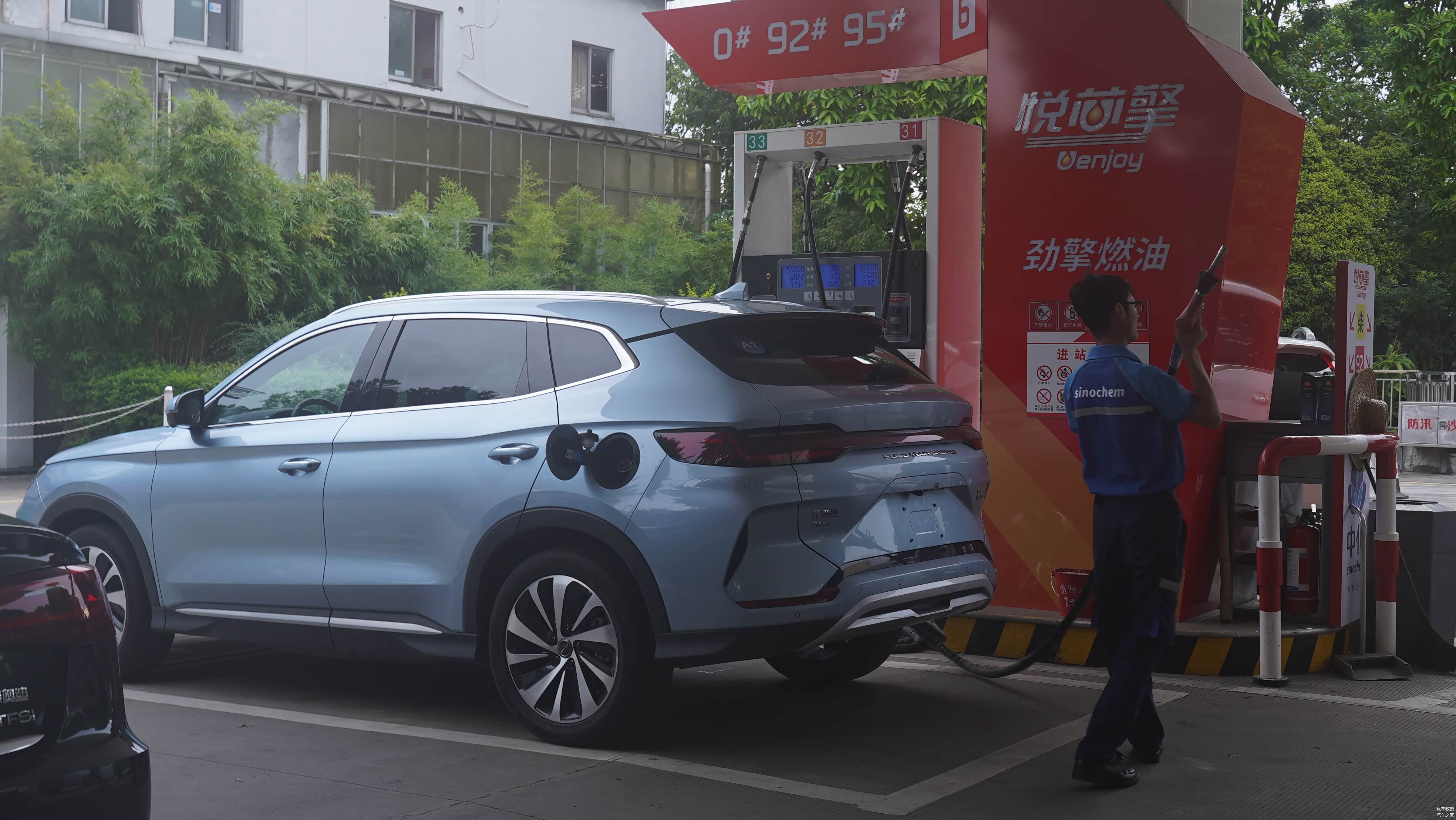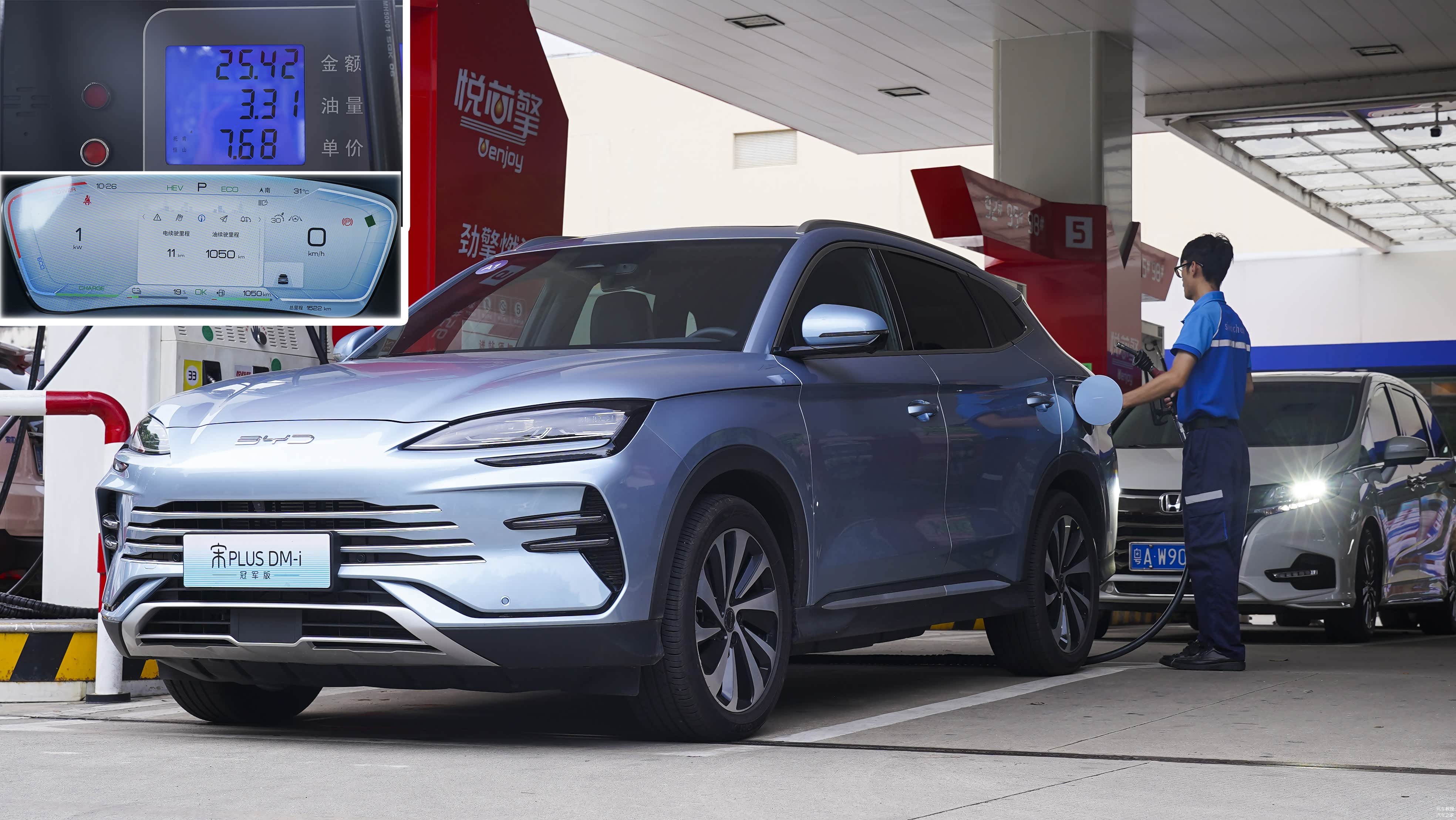 一切准备就绪,加油至“跳枪”后,比亚迪宋 PLUS DM-i表显综合油耗为1050km(动态续航),表显电量为19%,在电量低于25%以下时属于馈电状态,处于混动模式介入最低电量,在这样的状态下测试更有说服力。