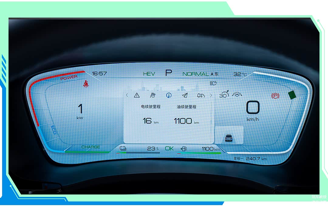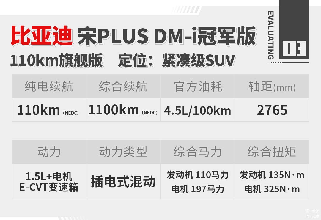 为了最大程度贴合用户的使用场景,教授本次选择了比亚迪宋 PLUS DM-i 冠军版110km旗舰版车型,官方售价16.98万,搭载比亚迪DM-i超级混动系统,由一台1.5L混动专用发动机+E-CVT变速箱和驱动电机组成。动力电池方面,配备18.3kWh的比亚迪刀片电池,官方纯电续航110km,综合续航里程将达到了1100km,可以满足不同用户在全场景下的用车需求。