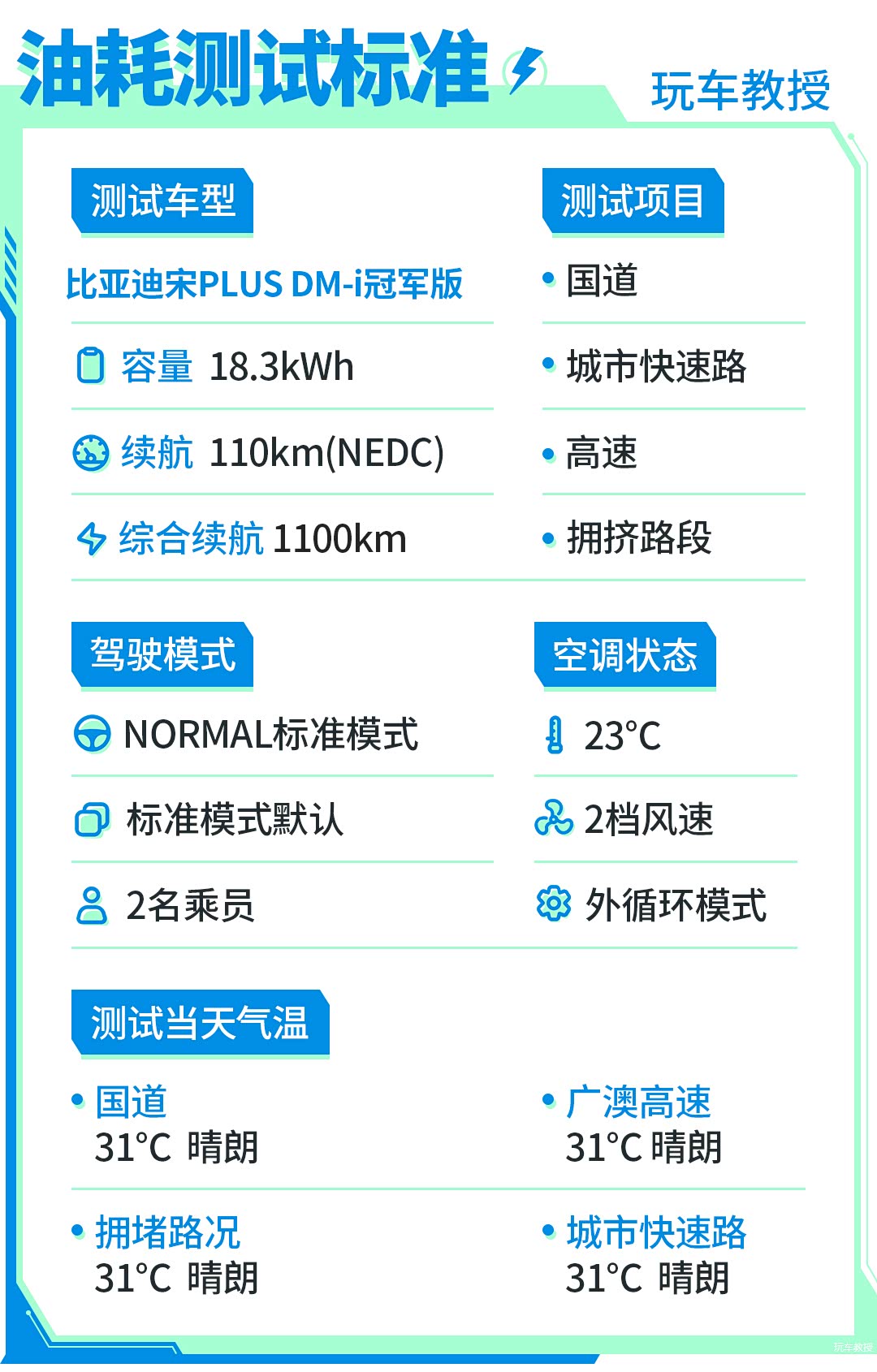 为了得到比亚迪宋 PLUS DM-i 冠军版真实准确的油耗数据,测试路况将包含市区、拥堵、快速路、国道、高速路况。为了进一步减小因驾驶习惯不同导致的误差,此次油耗测试由两名测试人员轮流驾驶完成。测试过程中不会限制车辆正常功能的使用,包括听音乐、手机充电、空调开启等等,整个驾驶状态会较为温和,不会大油门超车变道,也不会龟速行驶影响他人驾驶安全。