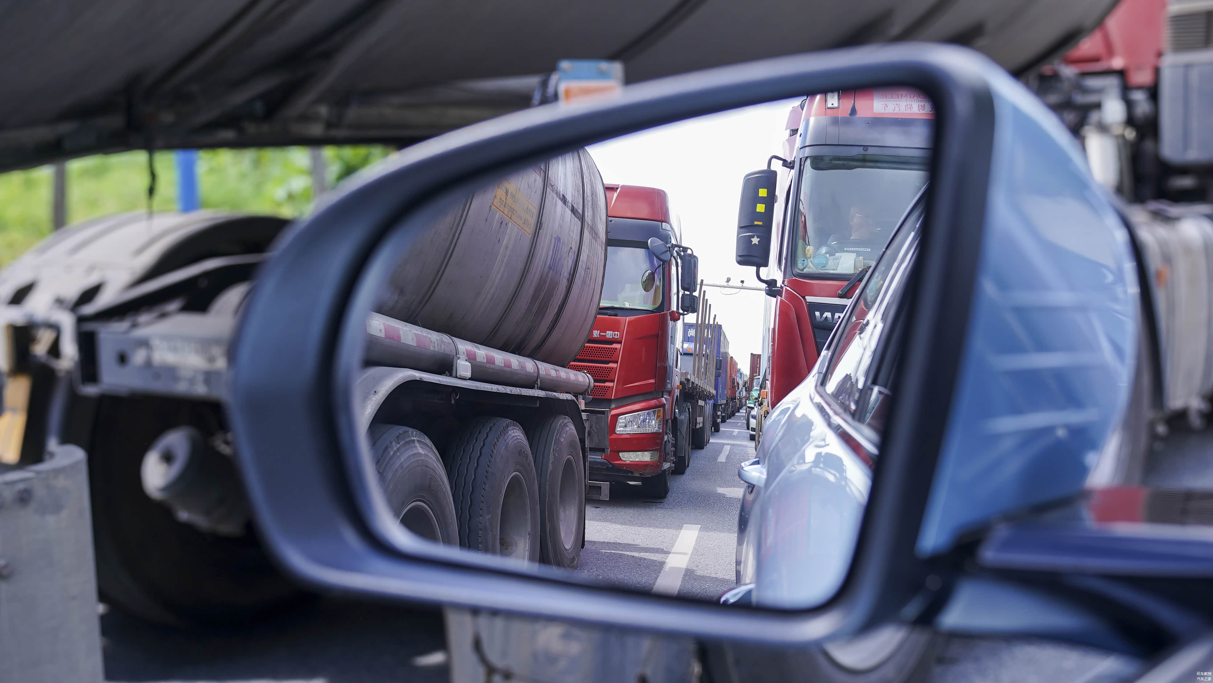 刚进国道没多久,明显能够感觉到货车的增多,由于前方出现交通意外再加上本就密集的车流,地图呈现出一片红色。四周全是大货车,且处于重载的状态,不仅是起步缓慢,还时常遇到小车的加塞,更是加剧拥堵,甚至在很长一段时间里我们都处于停滞不前的状态。