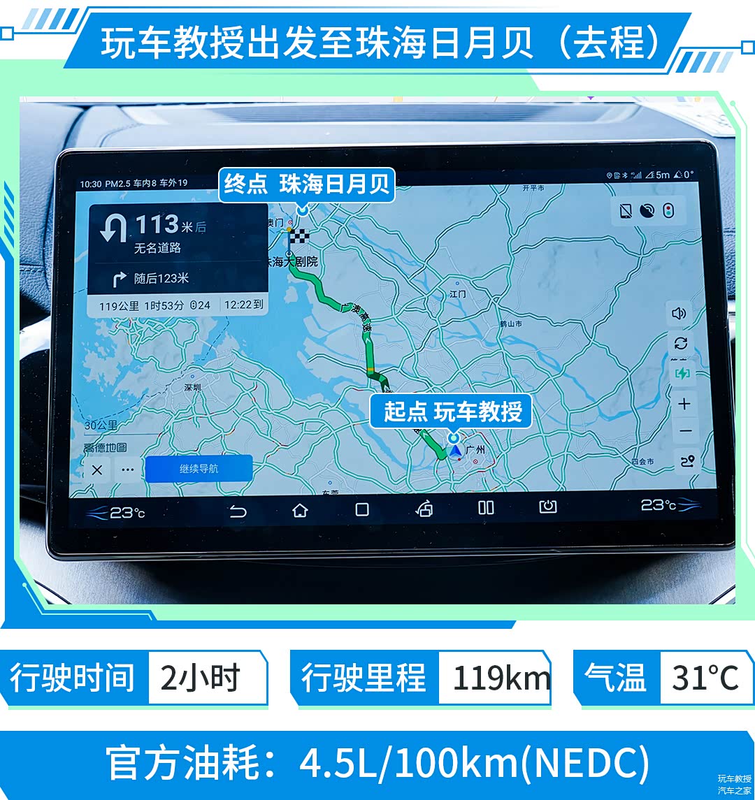 在油耗测试路线的选择上我们将从广州创投小镇出发,前往珠海市日月贝,去程经由广州环城高速-广澳高速以及达到珠海后的城市道路。此路线高速占比达到70%以上,最高限速120km/h,里程共计119km,车流量适中,交通状况较好,符合用户在高速路况的出行场景。在经过的城市快速路当中不乏道路维修、车流汇合、车辆事故等原因造成的拥堵。