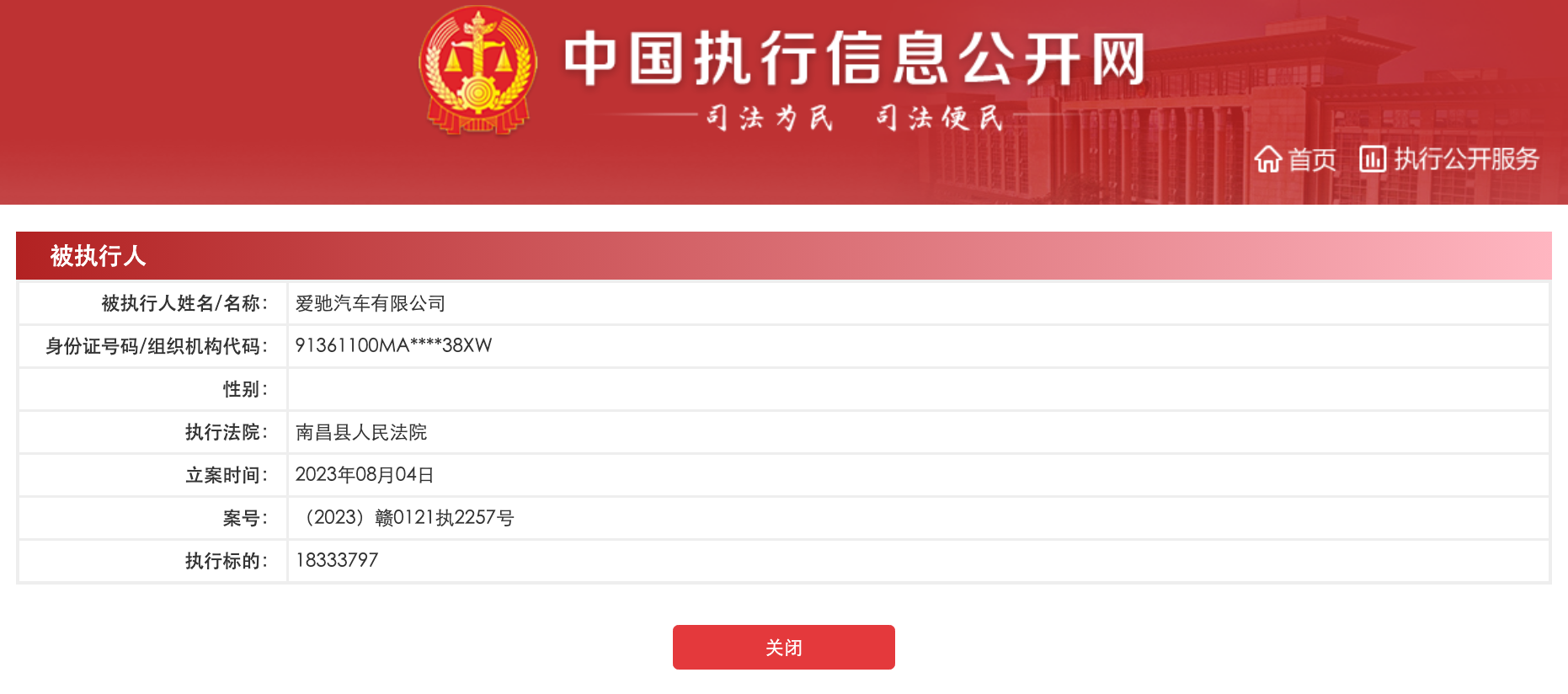据中国执行信息公开网显示,爱驰汽车有限公司新增被执行人信息,执行标的1833.38万元,执行法院为南昌县人民法院。