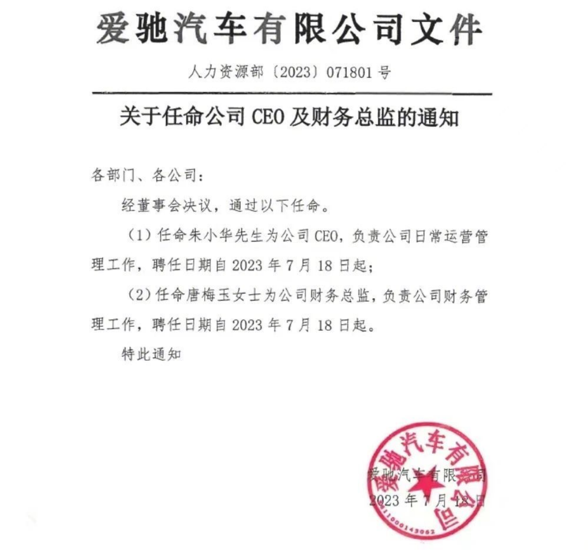 7月21日,爱驰汽车发布《关于任命公司CEO及财务总监的通知》。爱驰汽车表示,任命朱小华为公司 CEO,负责公司日常运营管理工作,聘任日期自2023年7月18日起;任命唐梅玉为公司财务总监,负责公司财务管理工作,聘任日期自 2023年7月18日起;