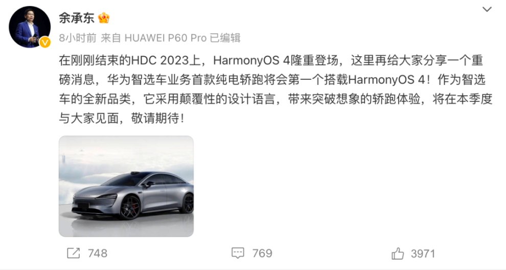 而在最近,华为常务董事、终端BG CEO、华为智能汽车解决方案BU CEO余承东,也在个人的社交平台上发布了华为智选车业务首款纯电轿跑的官图,并表示该车将会第一个搭载HarmonyOS 4!