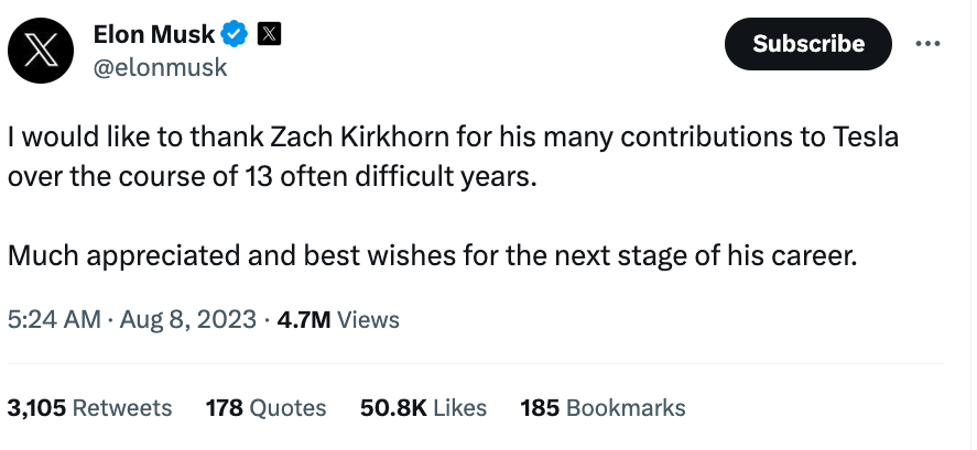 在离职消息曝出来的当天,柯克霍恩也在领英写道,“成为这家公司的一员是一种特殊的经历,我为我们共同完成的工作感到非常自豪。我还要感谢马斯克的领导能力和乐观精神,这激励了很多人。”