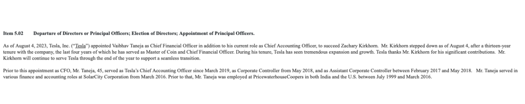 就在昨天,特斯拉递交给监管机构美国SEC的一份文件显示,公司CFO(首席财务官)扎克· 柯克霍恩(Zachary Kirkhorn)于8月4日辞职。