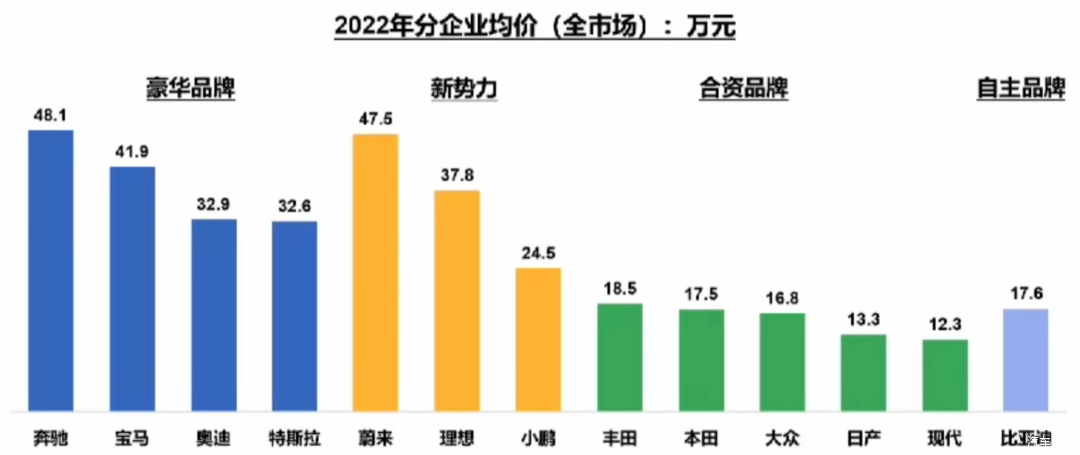 具体到品牌,2022年,蔚来已与奔驰均价相当,奔驰均价为48.1万元,蔚来均价为47.5万元。理想均价37.8万元,超过奥迪,和宝马接近。比亚迪腾势旗下三款主销车型均价均超过30万元,与特斯拉、奥迪、宝马不相上下。