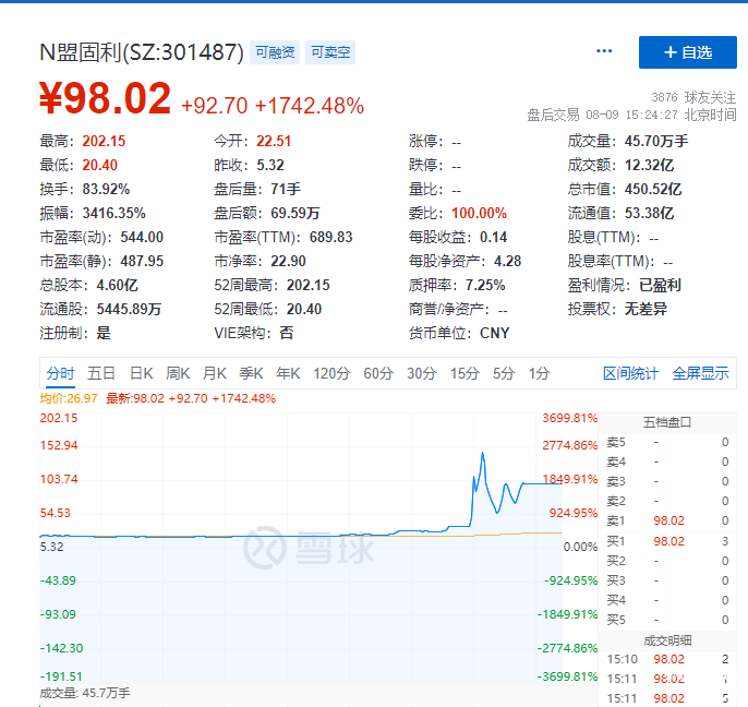 有人算了一下,盟固利发行价为5.32元/股,盘中最高涨至202.15元/股,中一签(500股)投资者缴款2660元,若在上市首日最高点卖出,盈利可达9.84万元。