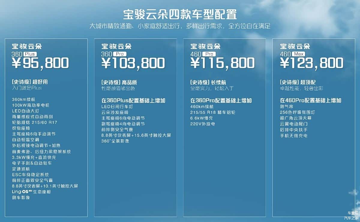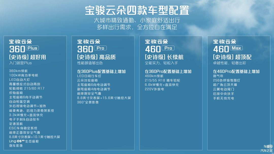 总的来说,宝骏云朵还是比较适合拿来家用的,哪怕是9.68万的360 Plus版,也能在满足基本家用需求的同时,带来还算不错的用车体验。中高配的360 Pro、460 Pro和460 Max也各有特点,配置丰富的同时,能带来的出行体验也逐级提升。关键结合价格来看,宝骏云朵在面对同级车时优势很大,值得考虑。