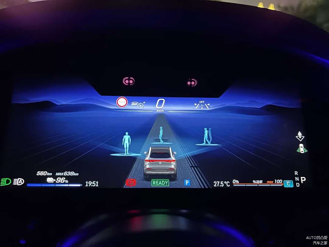 EQE SUV有多个动能回收模式,就通过方向盘旁边的拨片调节。最有意思的是那个D auto模式。它接入了雷达,摄像头甚至是GPS地图,动态地调整不同场景下,车辆自己减速和回收能力的强度。