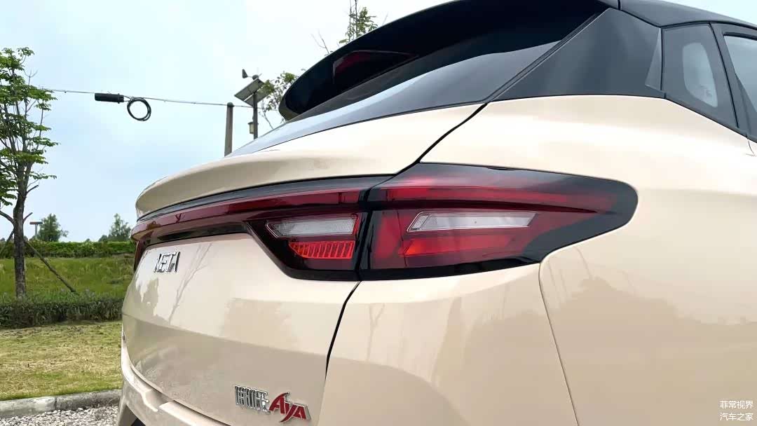 相较于老款的哪吒V,哪吒AYA车尾的变化还是挺大的,用上了时下流行的贯穿式尾灯。尾灯中间上部还“托”这小鸭翼,这设计有点巧思。以此同时,车顶的扰流板为车身增加些许运动气息。