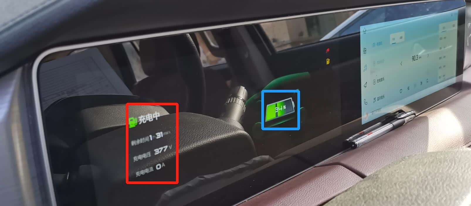 从车内横置的显示屏可见,车端充电电压为377伏等关键数据。比对车身铭牌显示的动力电池381.6伏额定电压相差无几。