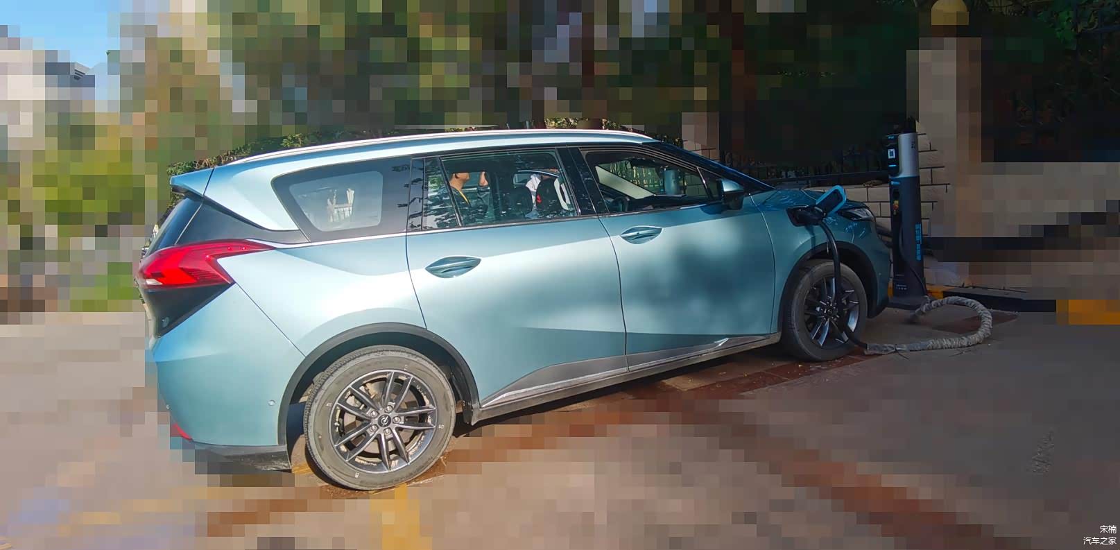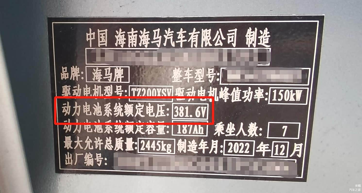新能源情报分析网评测组拍摄的这台海马7X-E的车身没有覆盖伪装材料,虽然还是“悬挂”的试制车牌,但是“保留”了动力电池额定电压381.6伏(381伏级)等关键技术参数的车身铭牌。