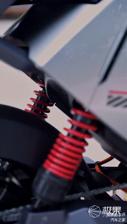F400T配备了5级可手调后避震,可以根据骑行者的体重、是否载人、路况状态选择适合的软硬程度,减少颠簸的同时,完全不会触底。极果君亲测即便是以中高速通过坑洼碎石路段,也几乎不受影响。12寸大轮毂配防滑轮胎,大大提升了抓地力,前220mm后170mm的大盘双碟刹带来摩托级的制动力。同时,F400T采用了高强度双管车架,彻底告别传统单管车架遭人诟病的“死亡摇摆”。