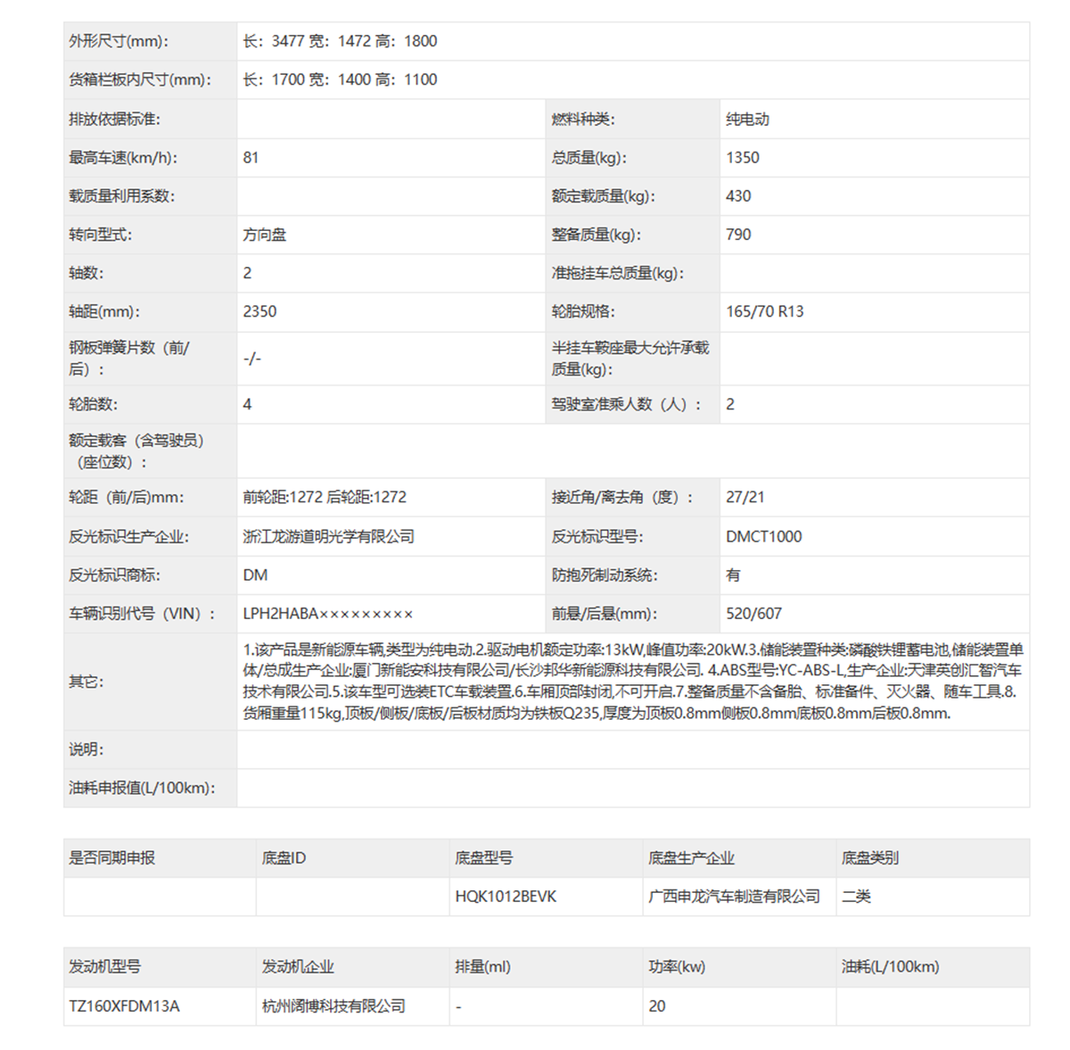 除了厢式车版本,新车还申报了底盘车。尺寸上,新车的长宽高分别为3477/1472/1800mm,轴距为2350mm,其整体尺寸要比五菱E10大很多,尤其是车身宽度,因此其采用的是2座布局,要比五菱E10更为实用。