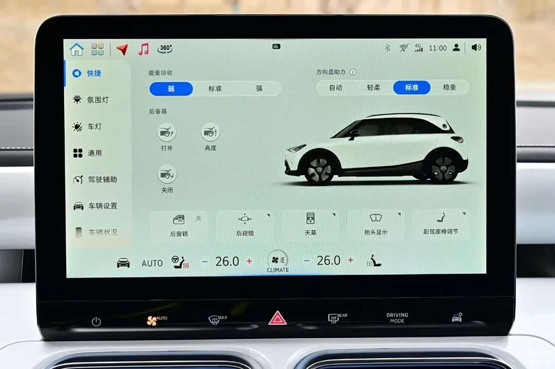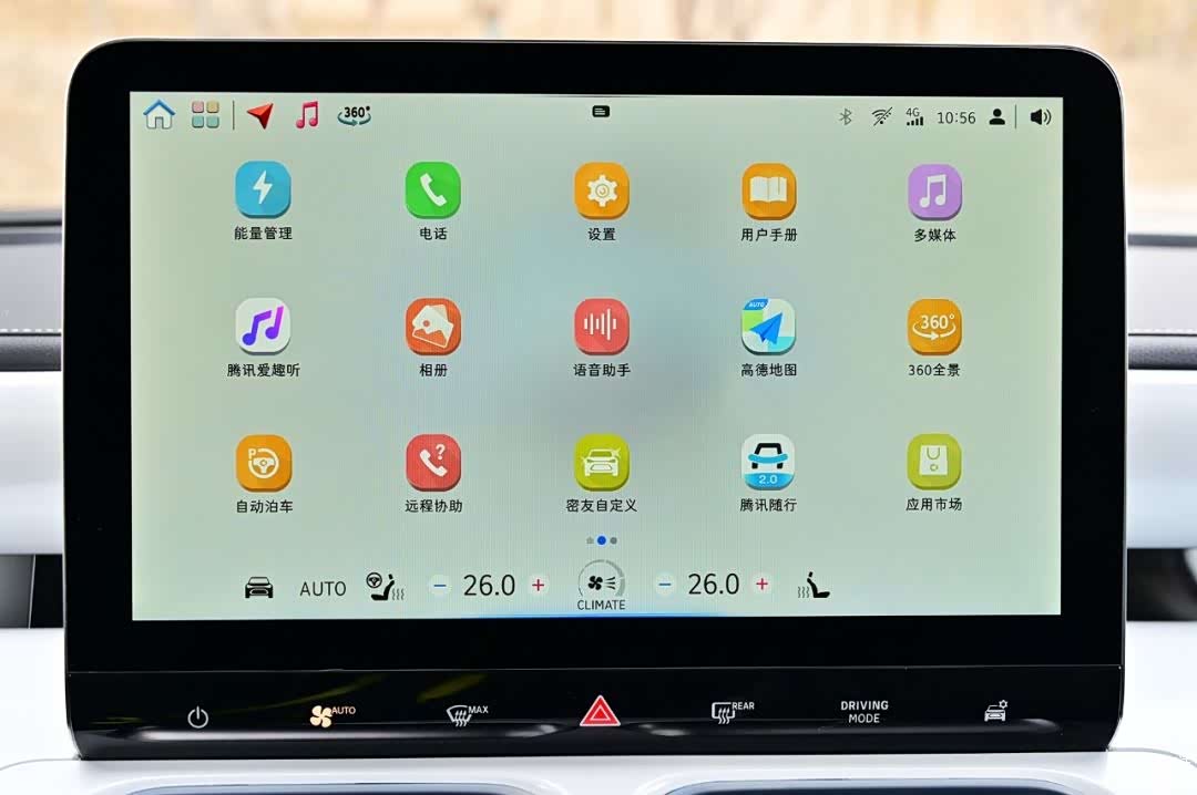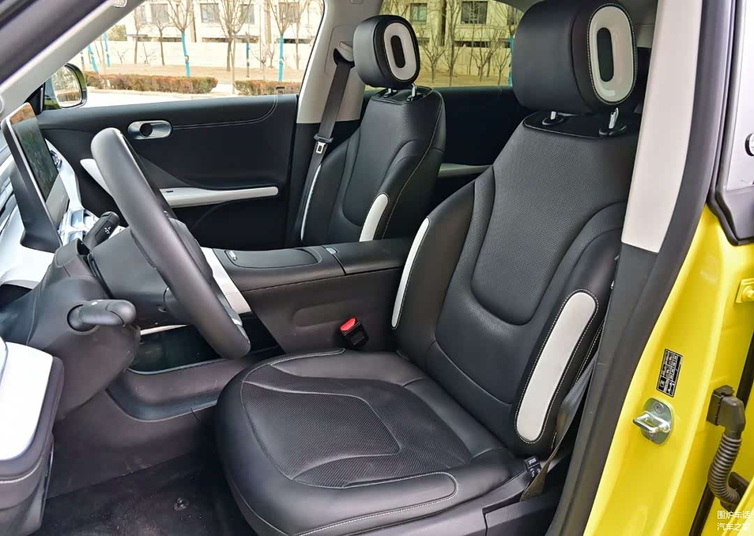 相对于外观车内层次丰富了许多,不过线条设计依然圆润,几乎没有一个直角,和圆润可爱的造型还是统一了风格。T型的中控台中间两个细长条出风口上方悬浮着12.8英寸的信息娱乐屏,三辐式平底方向盘中间是镀铬材质,看着十分精致。9.2英寸的液晶仪表藏在了方向盘后面,不遮挡前方的视线,界面简洁但信息清晰易读,前方还有HUD显示,驾驶者不用总低头就可轻松掌握信息。整个内饰黑色的氛围和白色的饰板对比强烈,白色带来时尚的视觉效果,而黑色的皮质则带来豪华的氛围。更炫的是晚上点亮他的64色氛围灯,车内轻奢的氛围更甚。