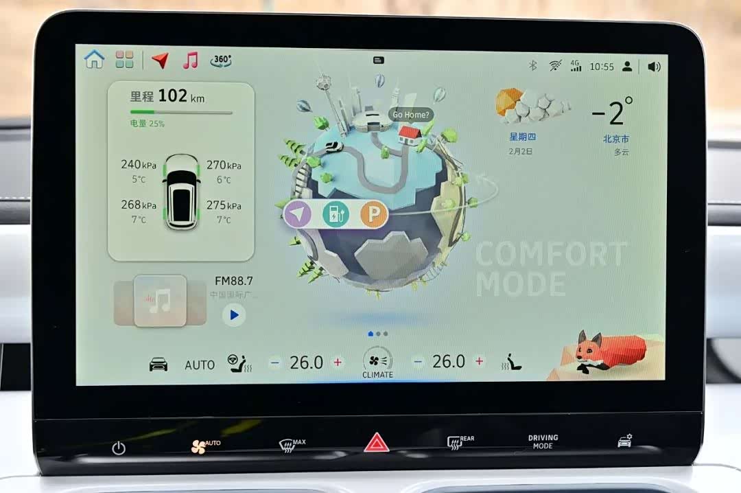 他的智能座舱主要来自于中间这款信息屏,车机使用了高通骁龙 8155智能座舱芯片,不论是语音还是触控打开程序反应都非常快。12.8英寸的中控屏搭载了“灵感星球”smart OS全场景数字生态车机系统,主界面风格非常前卫,语音、导航、还有各种娱乐程序、智能驾驶、OTA升级等功能非常齐全,是当下领先的水准。同时它界面上的小狐狸形象的精灵助手也是系统一大亮点,不仅有多种3D动效,而且点击它可以直接唤醒,既可爱又实用。
