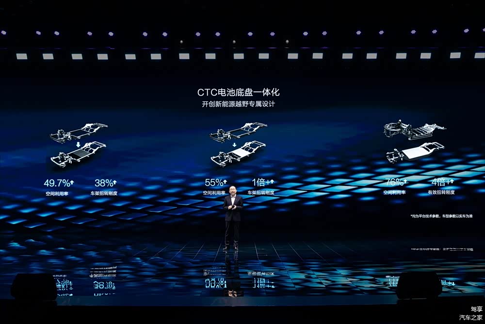传统越野车为了提升车身扭转刚度和通过性,对大梁进行专门强化,这也将进一步加大整车重量,并抬升整车重心,增加了侧翻的安全隐患并导致操控性差。DMO以创新性理念,给出“两全其美”的解决方案:将具备本征安全的刀片电池和高强度钢大车架强强融合,演化出真正的CTC电池底盘一体化技术。刀片电池既是能量体、也是结构件,不仅能保证极端越野场景下的电池安全,还能带来更多的整车安全提升。