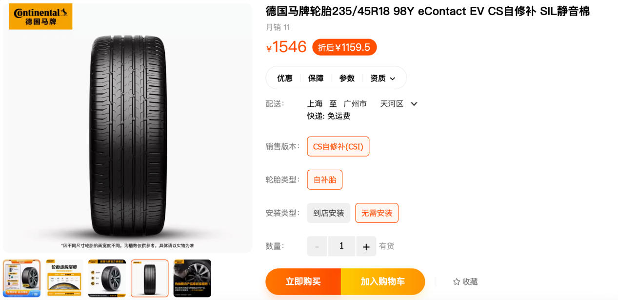 售价1160元/条,如果所在地路况不太好,经常容易扎钉,可选择这款马牌eContact系列轮胎。