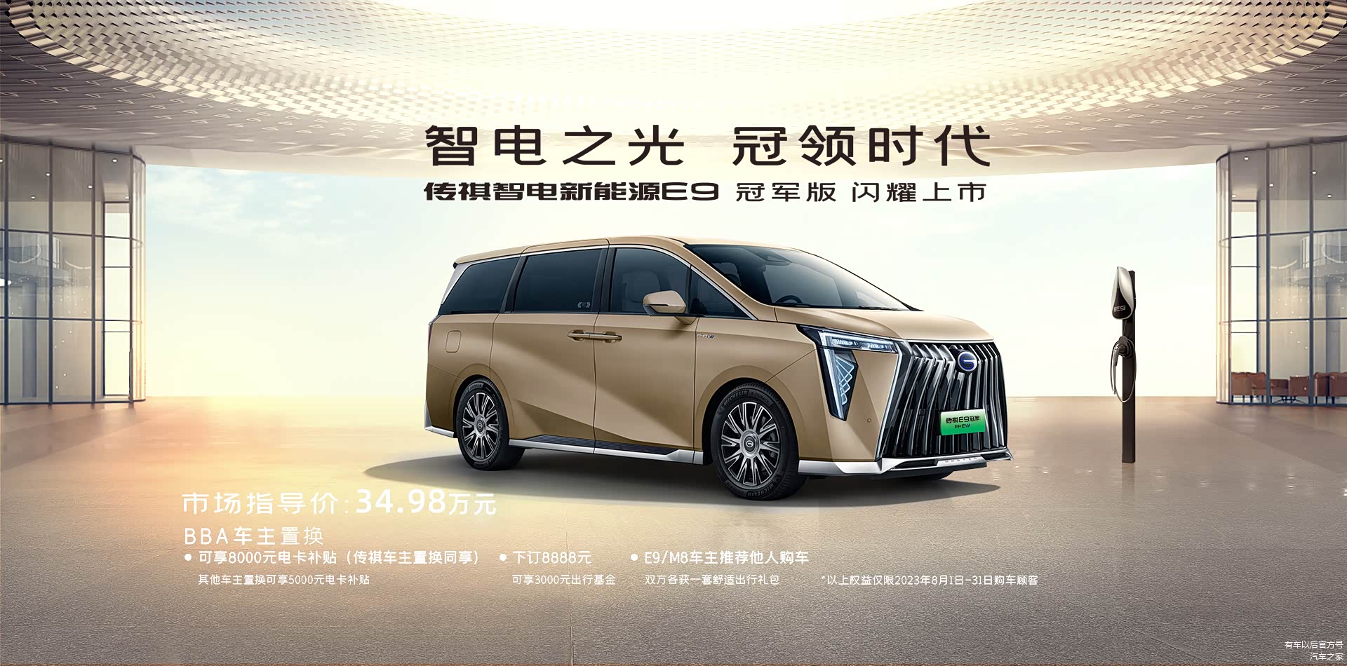 传祺E9推出特别版车型,并命名为“冠军版”,主要变化集中在外观及配置方面。E9冠军版车长5212毫米,轴距和M8一致为3070毫米。此前在传祺M8宗师版和E9宗师版上饱受好评的“东方雄狮”前脸被下放到冠军版上,和PRO版和MAX版的鲲鹏展翼前脸作出区分。