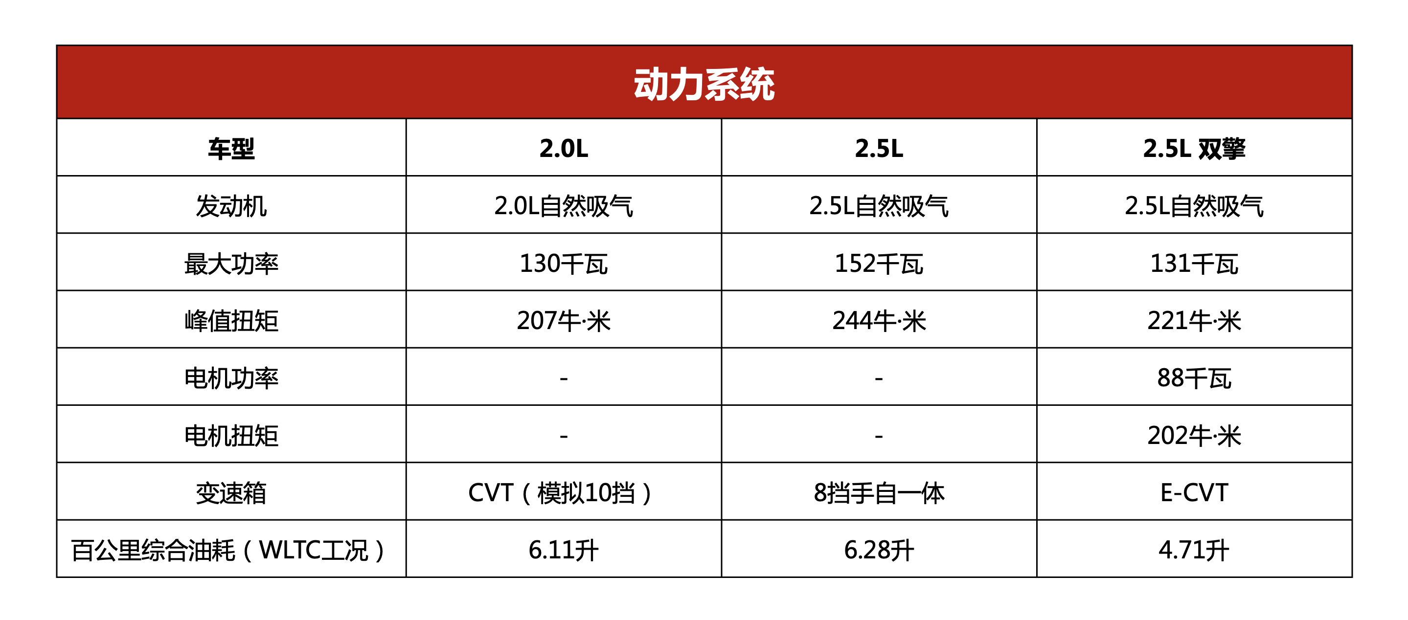 2.5L自然吸气发动机具备VVT-iE智能电动可变气门正时、进气歧管双喷射、激光熔覆气门座等技术,拥有13:1的压缩比和高达40%的热效率,兼顾了性能与油耗。2.5L双擎车型则应用了丰田最新的THS混动技术,其拥有结构更简洁、重量更轻、动力损耗更小的优势,加速能力相较上一代混动系统提升了10%,同时油耗可以低至4.71升/100公里。