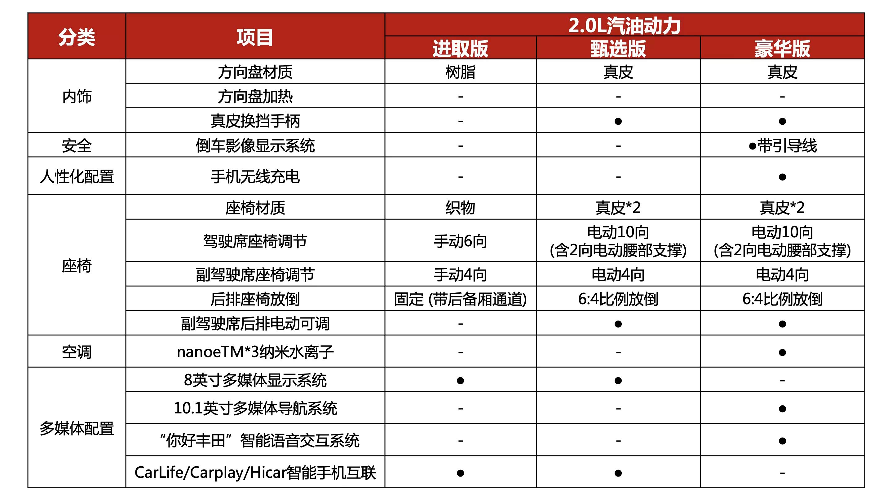 相比入门款的进取版车型,臻选版车型在配置上更为丰富。比如新增了真皮方向盘和真皮换挡手柄,提升了驾驶者每天驾车出行时刻触碰之处的触感,在乘坐感受方面也大幅提升,座椅材质调整为真皮,驾驶席支持10向电动调节(含2向电动腰部支撑),副驾座椅在升级为4向电动调节的同时还支持后排电动可调,后排座椅也支持6:4放倒让储物空间更为灵活多变,这些配置之前都是豪华版车型的标配,如今出现在臻选版车型上,能够直接提升整车的舒适感与档次感。而且这些配置的增加只让臻选版车型的官方指导价上升了一万元,再加上本身已经不错的基础配置,直接将亚洲龙臻选版推上20万元级别B 级车天花板的位置。
