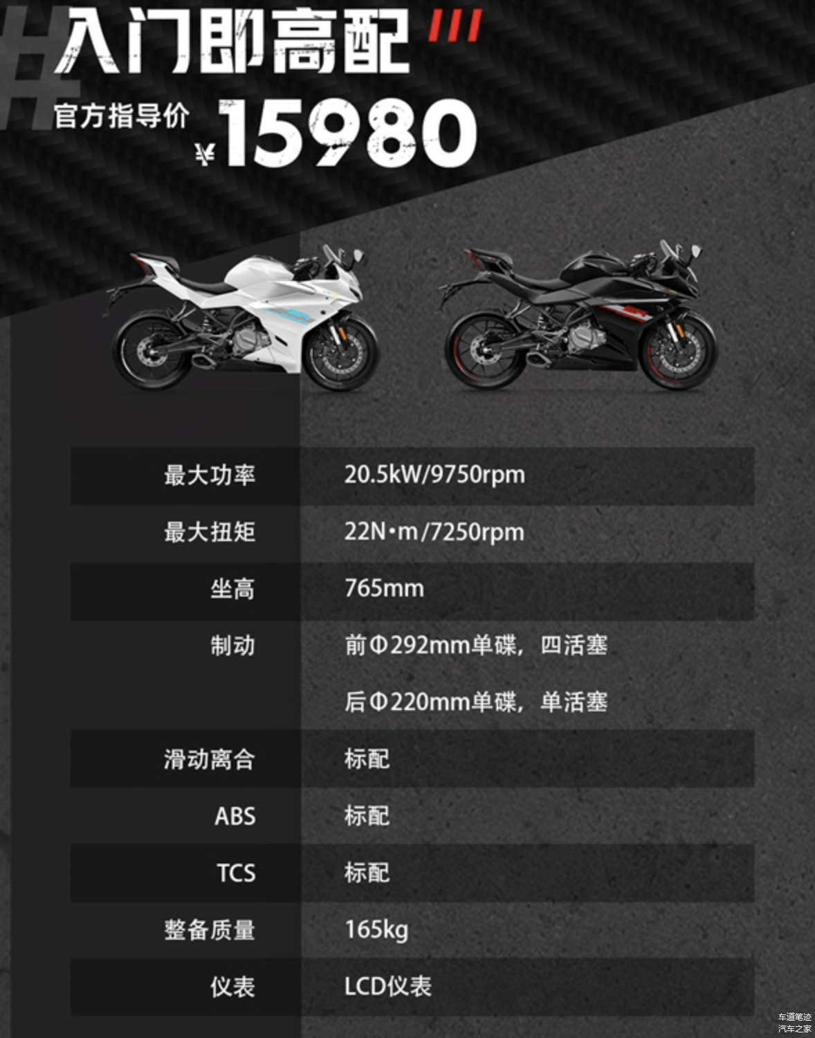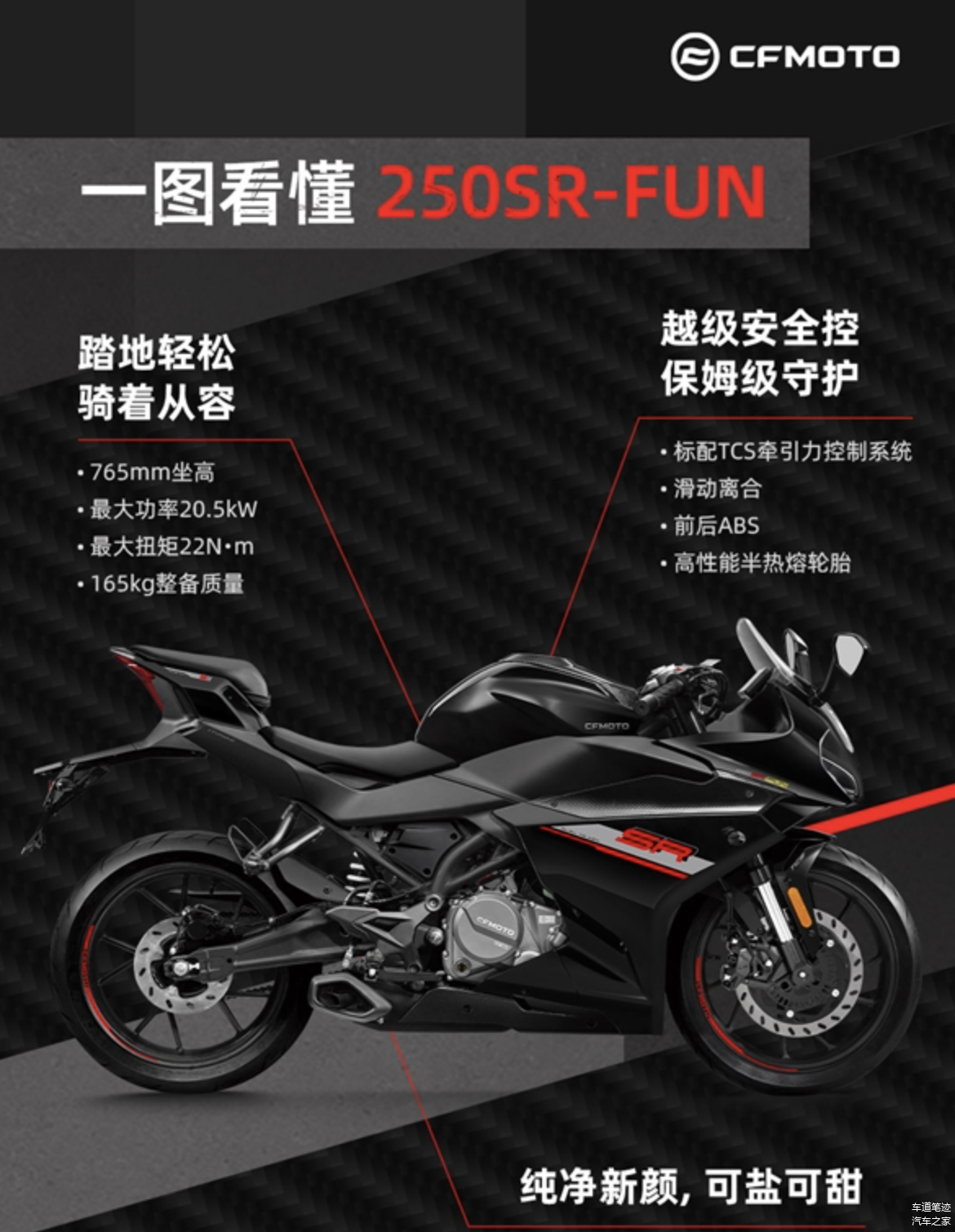 250SR-FUN是基于春风动力旗下的另一款跑车摩托250SR打造的,外观上沿用了SR家族的回旋镖式前脸和流畅的车身线条,提供白幽灵(星光白)和黑武士(星光黑)两种配色,用上了450SR同级漆水工艺,整体非常细腻且亮眼。该车的座高仅750mm,整备质量165千克,即便是1米5的小个子也能轻松驾驭。同时,该车配备了滑动离合器,标配TCS牵引力控制系统和ABS防抱死系统,装配的是高性能半热熔轮胎,抓地力和制动力更强。
