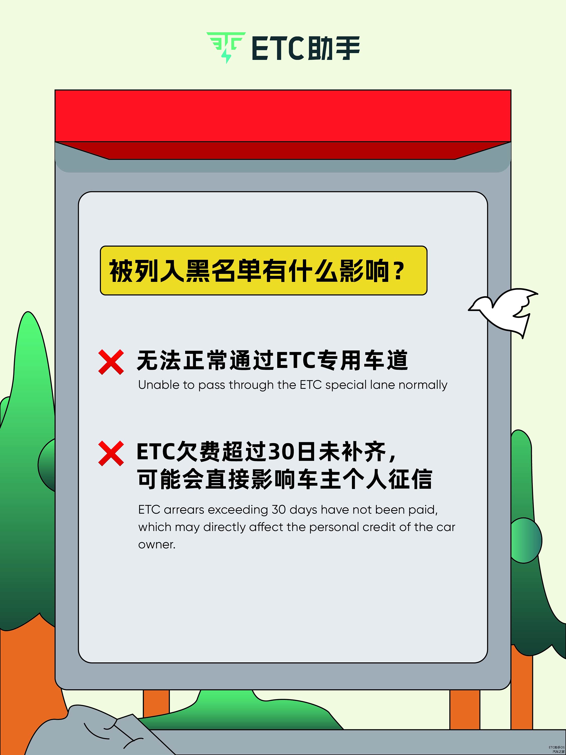 二、被列入黑名单有什么影响?①被列入状态名单的车辆,无法正常通过“ETC专用车道”②ETC欠费超过30日未补齐,可能会直接影响车主个人征信。