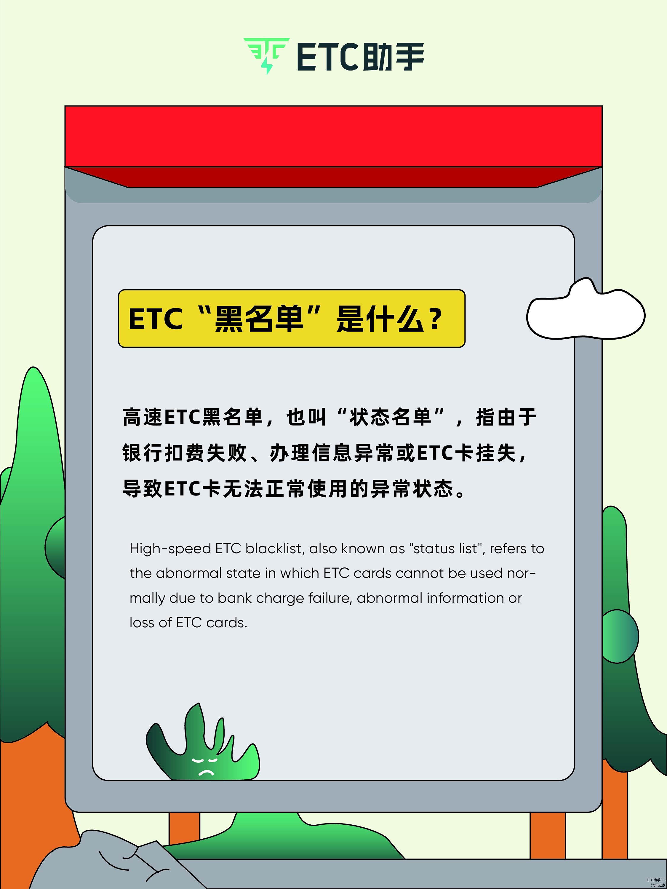 高速ETC黑名单,也叫“状态名单”。指由于银行扣费失败、办理信息异常或ETC卡挂失,导致ETC卡无法正常使用的异常状态。