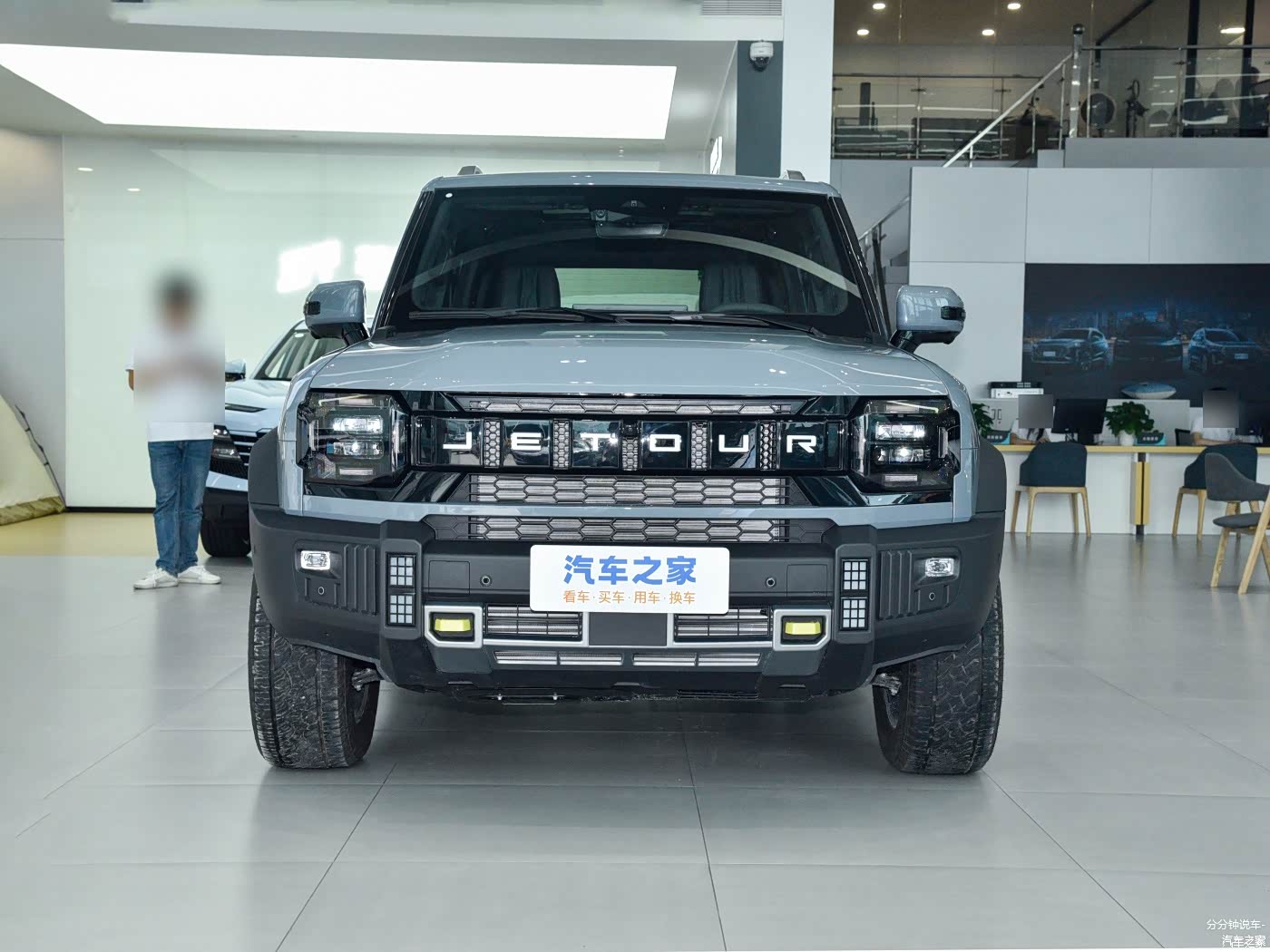 新车采用了非常硬朗的方盒子外观,让人不免想到路虎卫士,前脸的设计很有特点,其中网内部镶嵌着捷途的品牌标识,同时采用了大量的方格造型,尤其是四点式日间行车灯点亮的时候,辨识度很高。