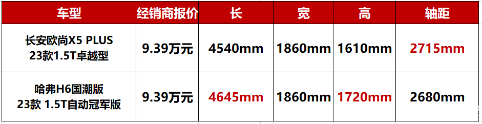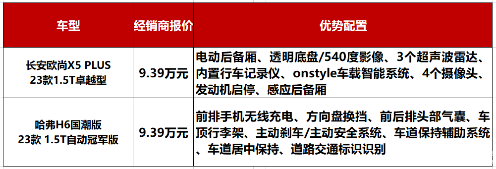 现在的10万级SUV市场用乱花渐欲迷人眼形容也不为过。车企内卷对于消费者自然是件好事,但这也容易催生出另一个难题:既然都不错,那谁又更好、更适合自己呢?这一期我们选择了10万级SUV中的热门选手,长安欧尚X5PLUS 23款1.5T卓越型和哈弗H6 国潮版 23款 1.5T自动冠军版,两款经销商报价均为9.39万元,给大家来一场公开公平的对比。