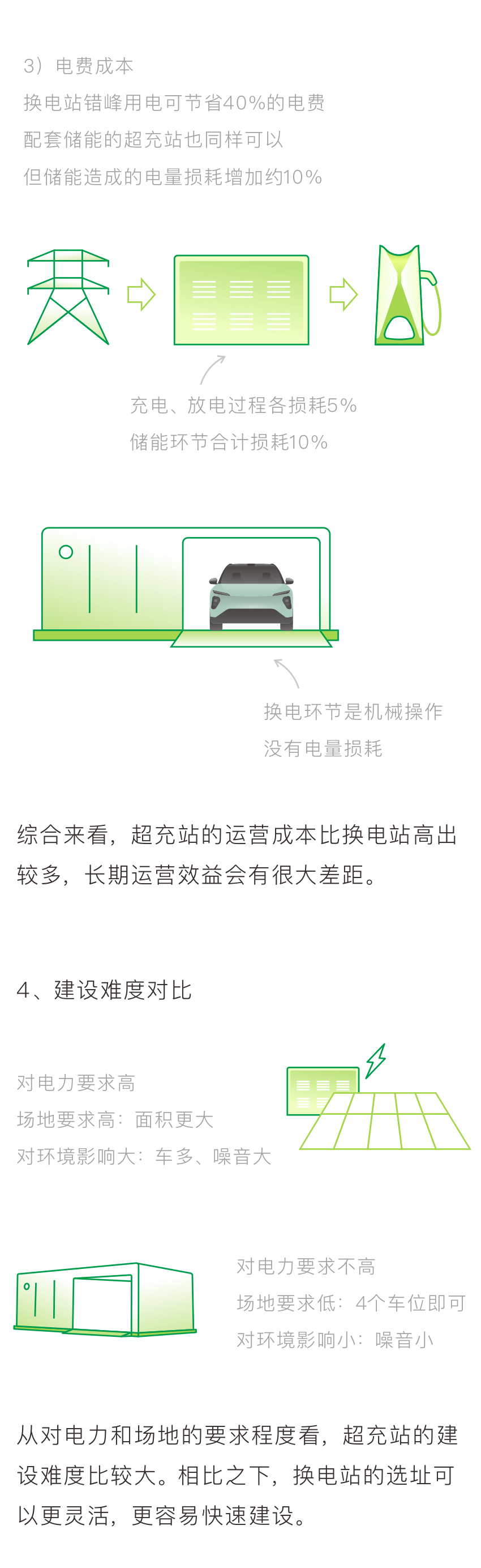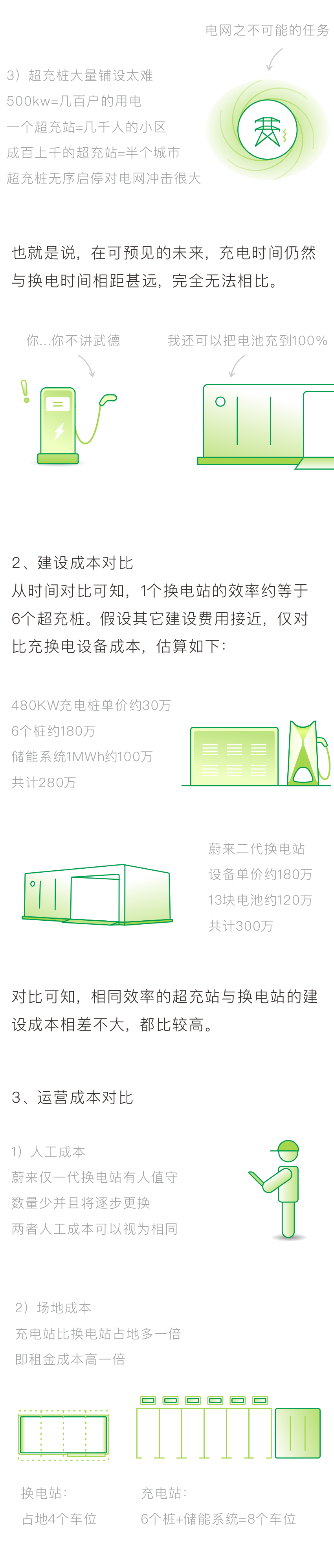 对比可知,相同效率的超充站与换电站的建设成本相差不大,都比较高。