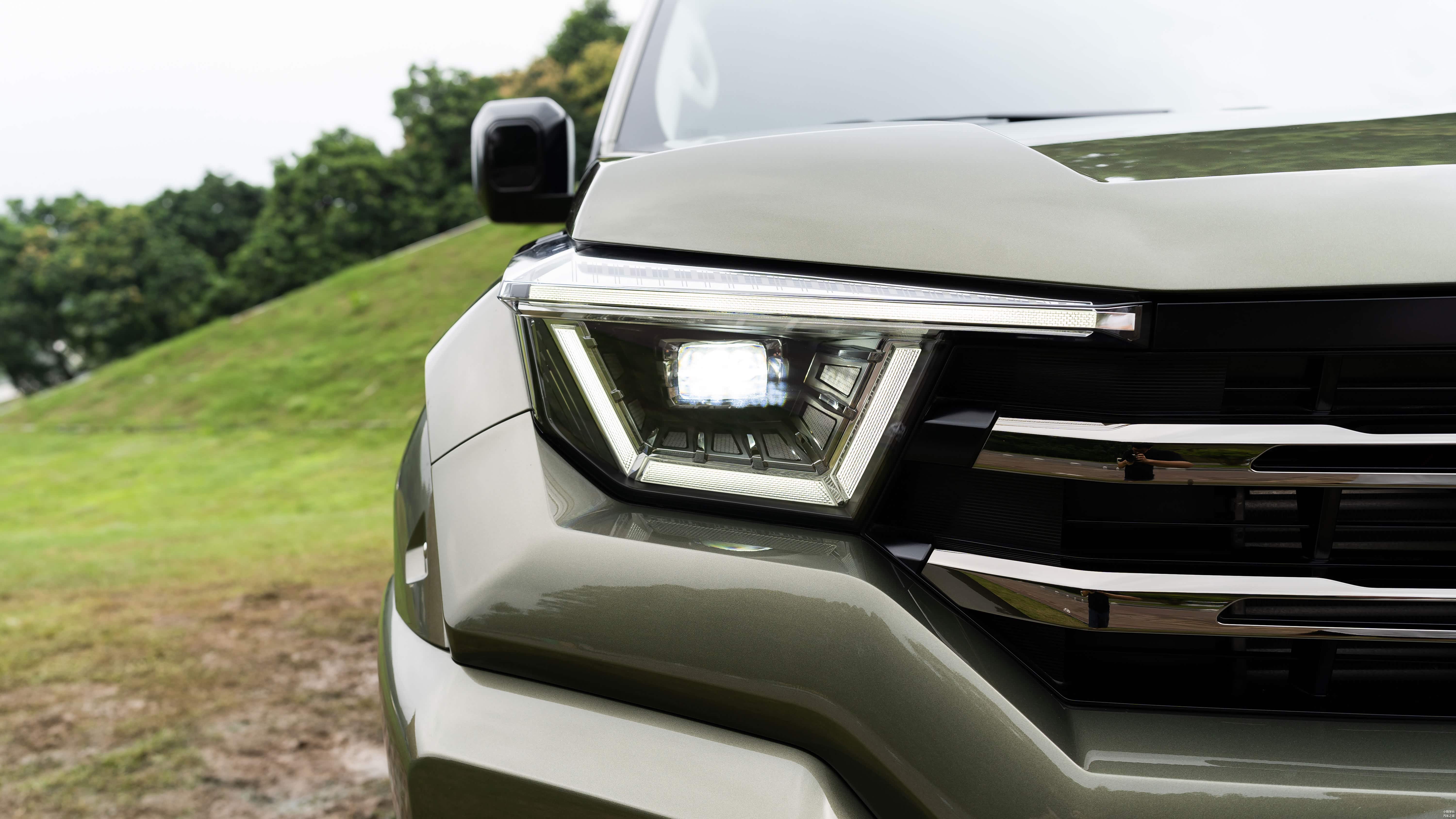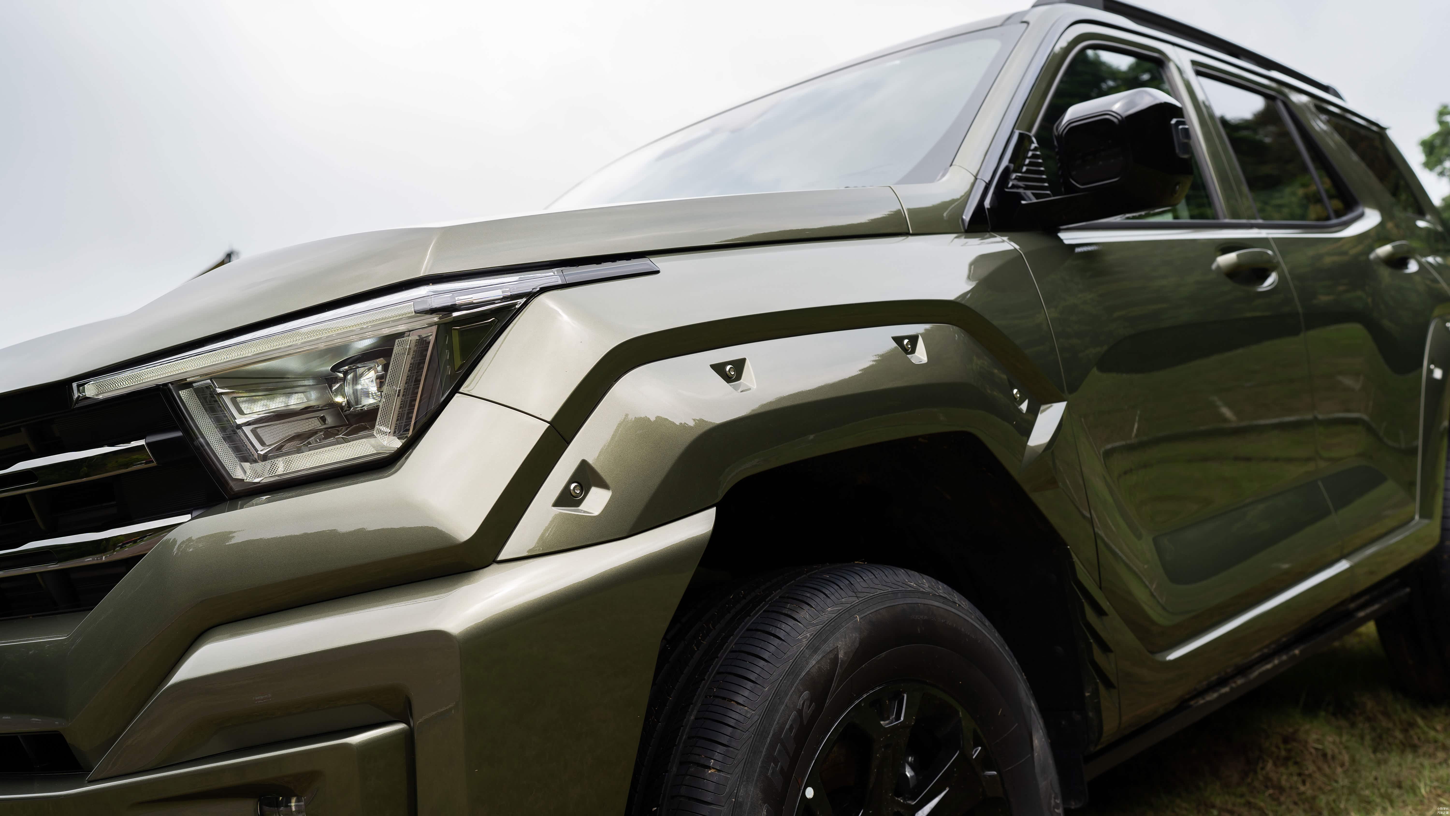 与时下国内SUV车型都走方盒子路线不同,坦克400Hi4-T上来就给你不一样的视觉感受,整车外观给我感觉就是「野」,外露铆钉设计、发动机舱盖上隆起线条,凶狠的机能仿瞳前灯,整体给你很有视觉冲击力,很个性。