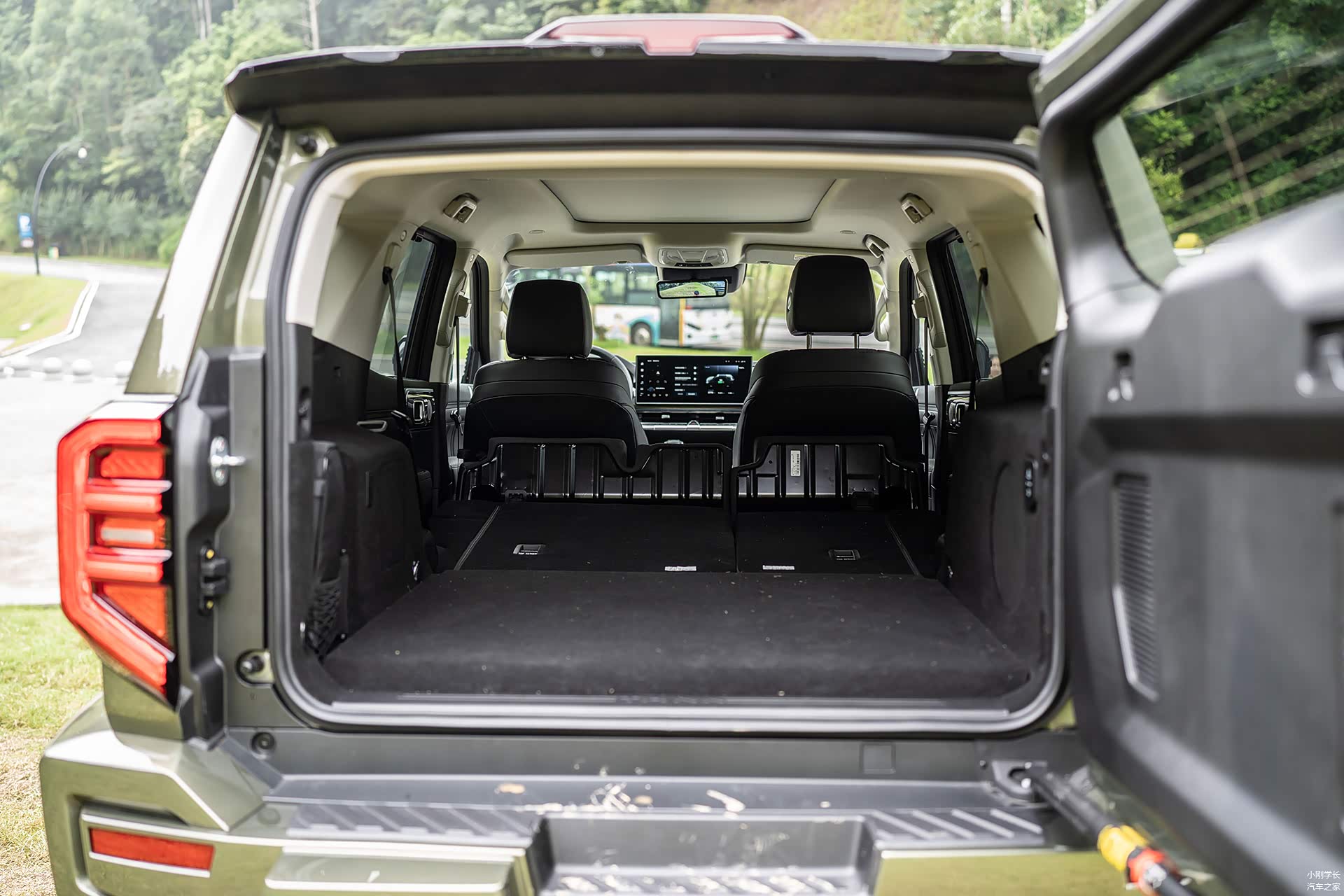 后备厢为侧开门方式,采用电吸设计,而且自适应液压挺杆可以让尾门开启不同角度,如果是在不平路面或者斜坡打开,还能手动锁止。后备厢常规容积为566L,将后排座椅放倒之后能够形成平整的载物空间,容积拓展至1803L,在自驾游也能作为床车使用。