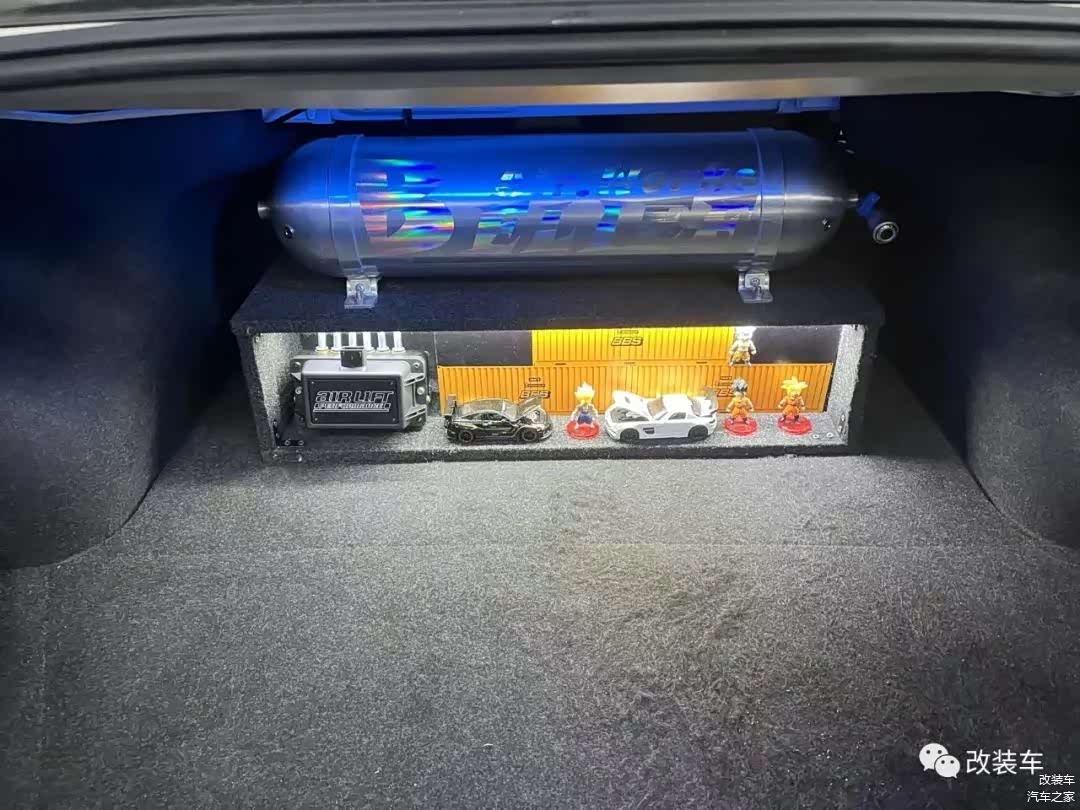 "行走部分,换上了AIR LIFT 3H控制系统+FEEL AIR气动搭配上19寸WORK VS轮毂,结合上CNC加长下摆臂做出了个前-7度、后-7.5度的倾角姿态。"