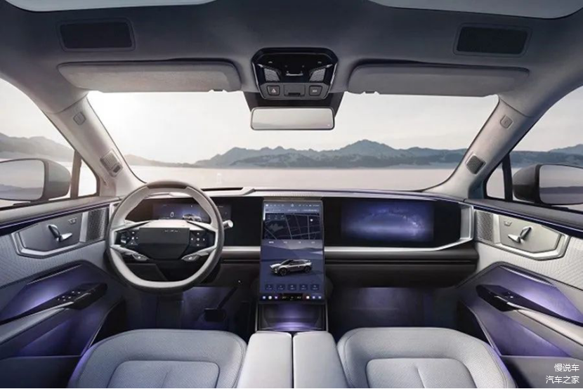 内饰方面,同样是极简的设计,例如此前我们就熟悉的木纹饰板、钢琴烤漆以及皮质装饰。进入哪吒S的座舱后,可以发现,以“四屏交互”为核心,包括17.6英寸悬浮式中控屏、12.3英寸副驾专属影音屏、AR-HUD抬头显示、13.3英寸隐藏式仪表屏。另外还有1.9㎡全景隔热天幕,手机无线充电,拥有加热、记忆等功能的行政级座椅等配置。